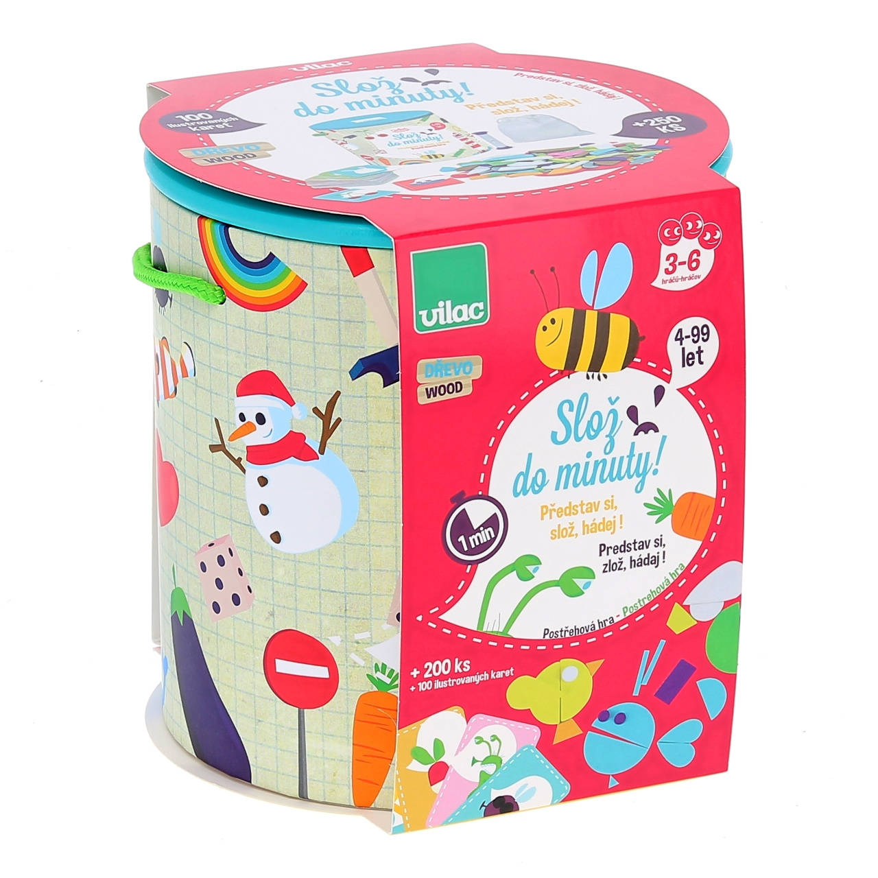a slovenským návodem dodávána v praktickém kartónovém kyblíku opatřeném potiskem v češtině. Hlavní vlastnosti: 4 figurky, 250 dílků, 100 karet předloh, přesýpací hodiny a bodovací tabulkapro 3–6 hráčůatraktivní zpracovánípraktické balení Pravidla hry Slož
