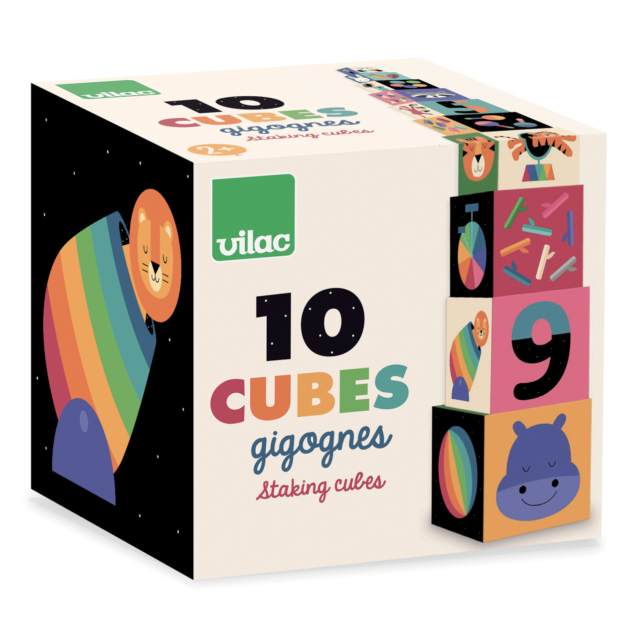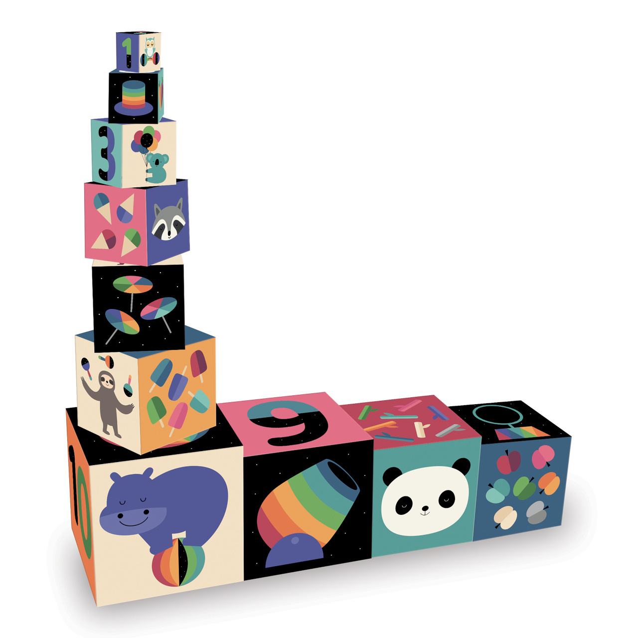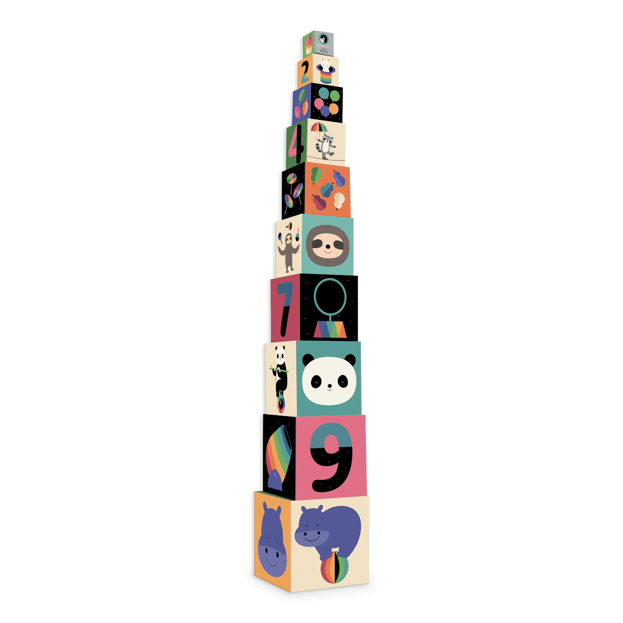 Nechejte děti objevovat duhový svět roztomilých cirkusových zvířat výtvarníka Andyho Westface, se soupravou jedinečných stohovatelných kostek. Stěny kostek obsahují originální ilustrace vztahující se také k příslušnému číslu. Nejmenší tak mohou čísla zábavně