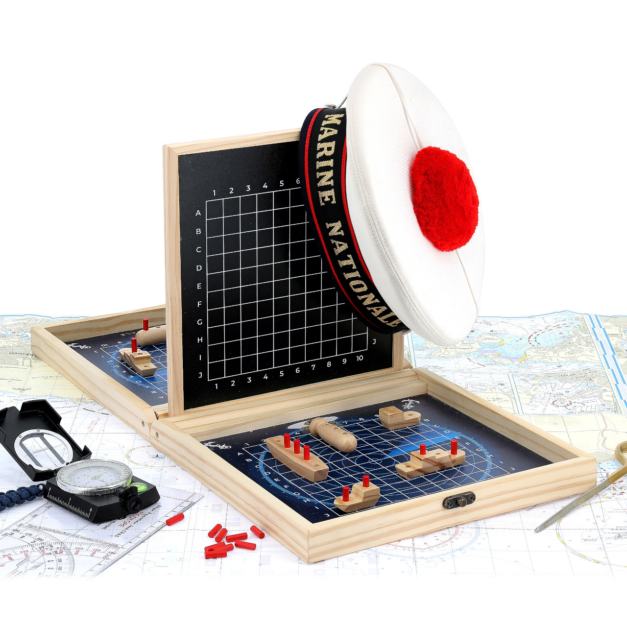 Klasická strategická hra v přenosném dřevěném kufříku, s motivy francouzského námořnictva může dětem pomoci zábavnou formou rozvíjet poznávací dovednosti. Cílem hry je střídavým tipováním v souřadném systému jako první odhalit pozice protihráčovy flotily
