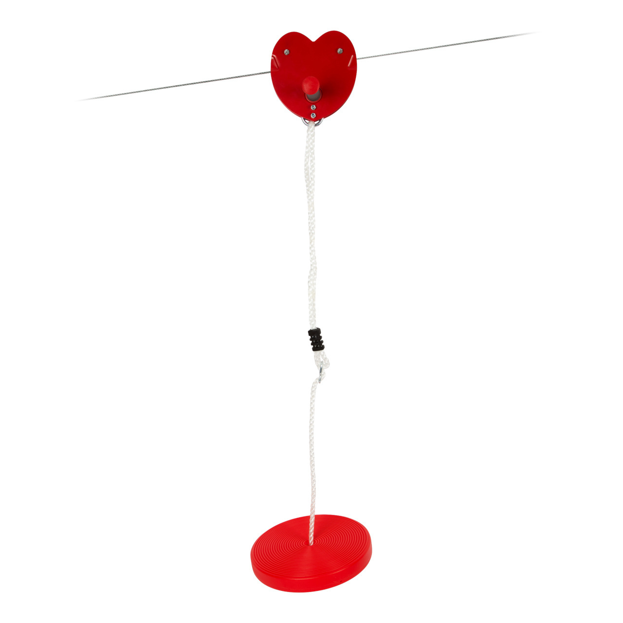 nebo v sedě, či ve stoje na diskové houpačce, která je součástí balení a můžete ji použít i samostatně. Pro bezpečné a měkké zabrzdění je konec lana opatřen gumovým návlekem. Odolný závěs houpačky je vybaven kovovým průvlekem, s pomocí kterého kdykoli snadno