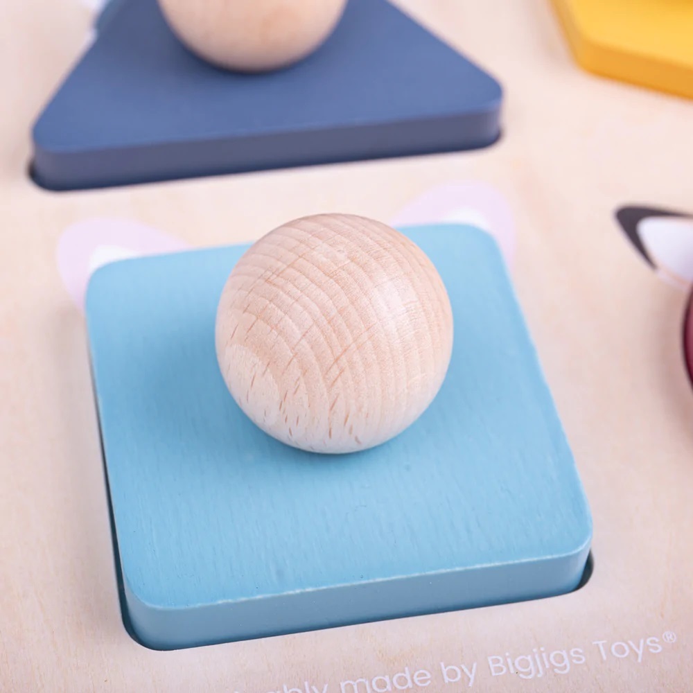 vhodná pro malé ručičky, protože mohou pomocí velkých dřevěných úchytů zvednout tvary a odhalit zvířátko pod nimi. Skvělý způsob, jak rozvíjet jemné motorické dovednosti a zručnost malých dětí při zvednutí, uchopení a zkoumání každého dílku skládačky. Vyrobeno