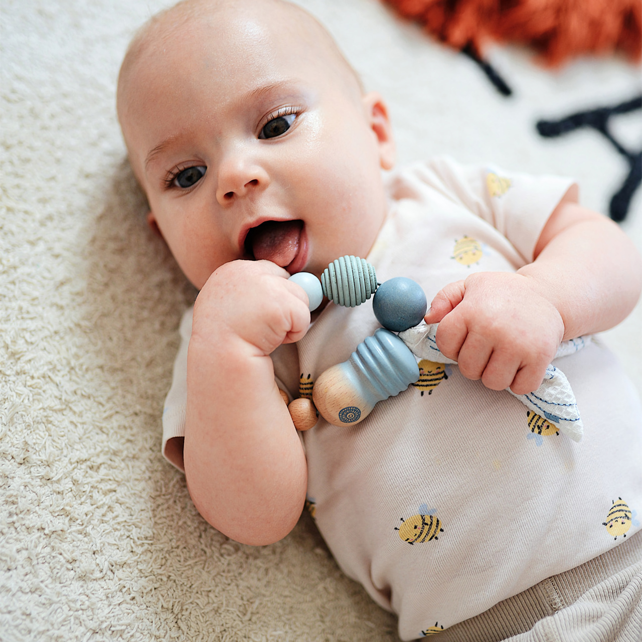 šustící fólií. Kuličky jsou navlečeny na pružné gumičce, jedna kulička má vroubky pro povzbuzení všech smyslů. Vysoce kvalitní dřevo a další přírodní materiály, zaoblené hrany a moderní barvy dělají z této sady absolutní poutač. Nezbytná součást vašeho sortimentu