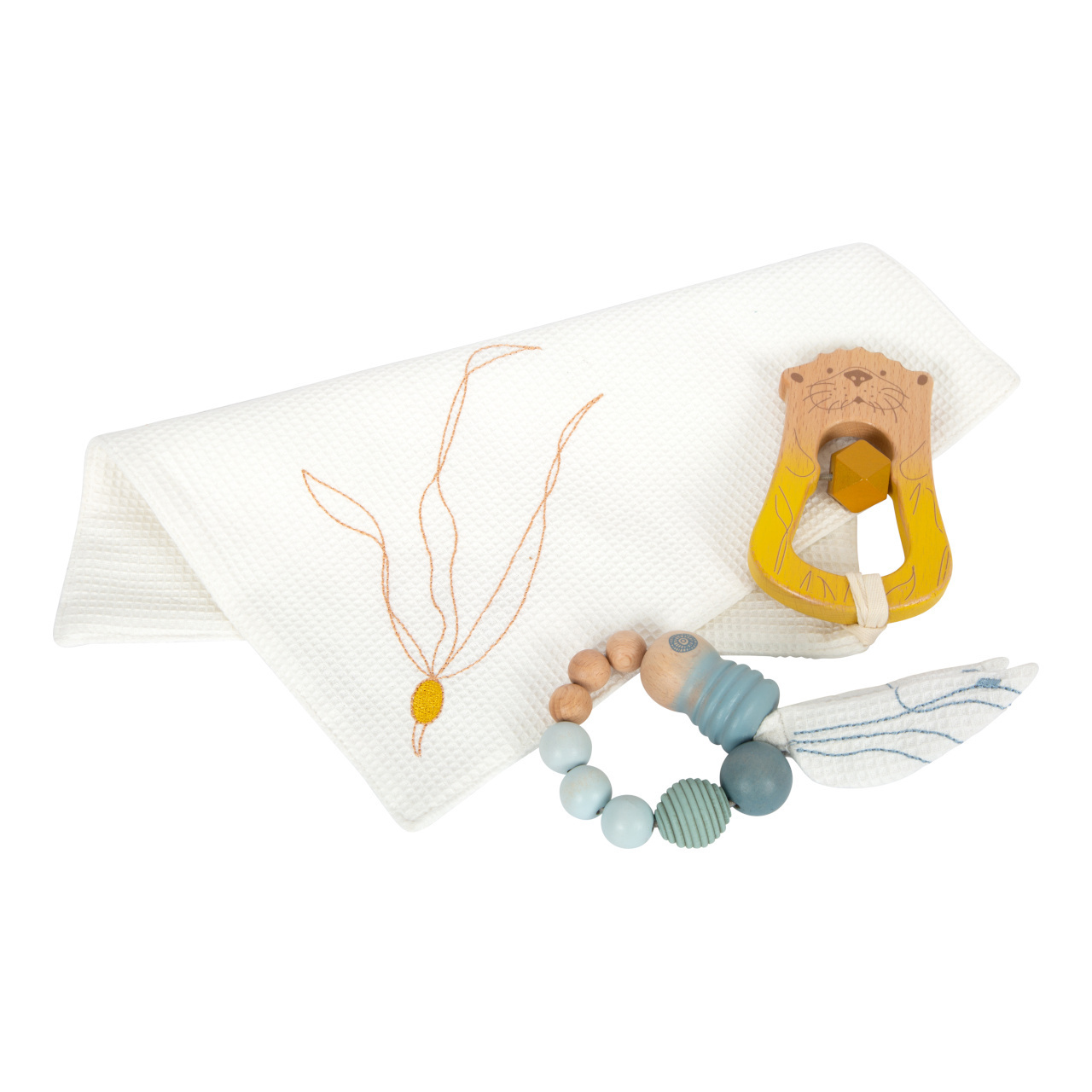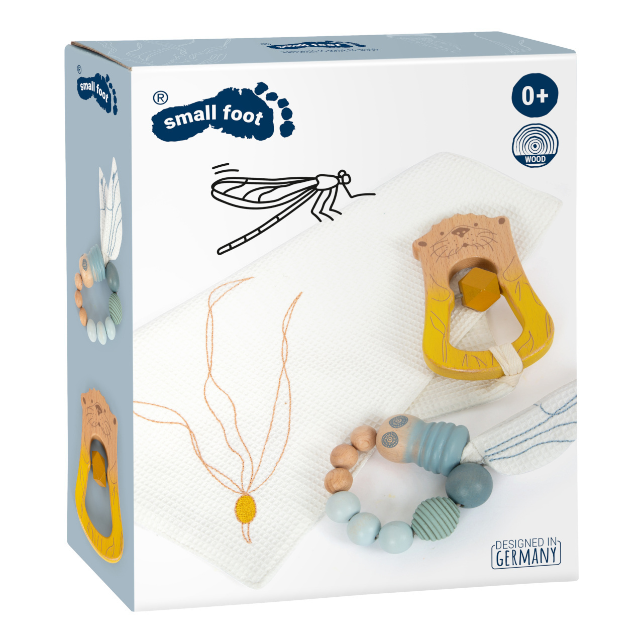 Zaujme jemným chrastěním, pomůže s prořezáním prvních zoubků. Utěrka z bavlny je vhodná jako hadřík na mazlení nebo slintání a lze k ní poutkem připevnit k chrastítko, dudlík nebo ji připevnit na kočárek. Sada je doplněna hračkou vážky, která má křídla vyplněná