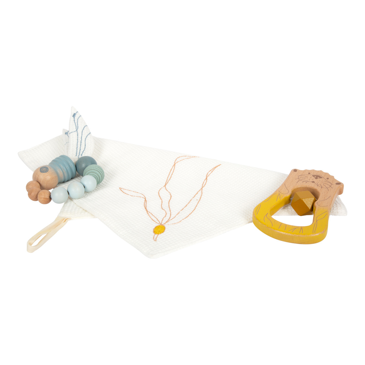 Rozměry látková utěrka: 29x29x1 cm Rozměry chrastítko: Ø 8 cm Materiál: látka, dřevo Věk: 2 měs.+
