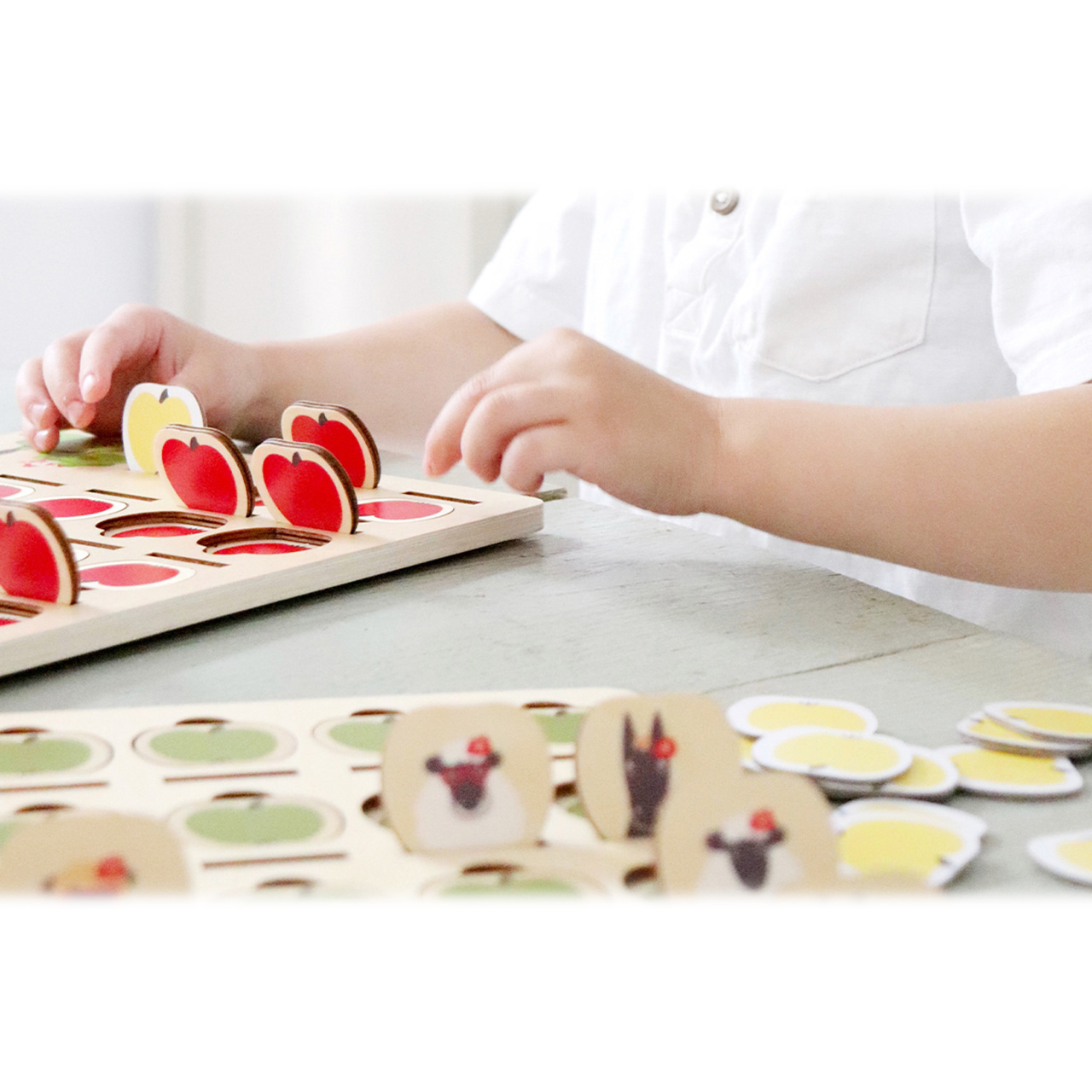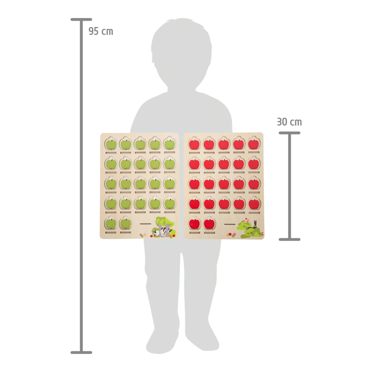 Hrací deska: 30x23x1 cm Rozměry jablka: 3,5x3x0,5 cm Materiál: dřevo,
