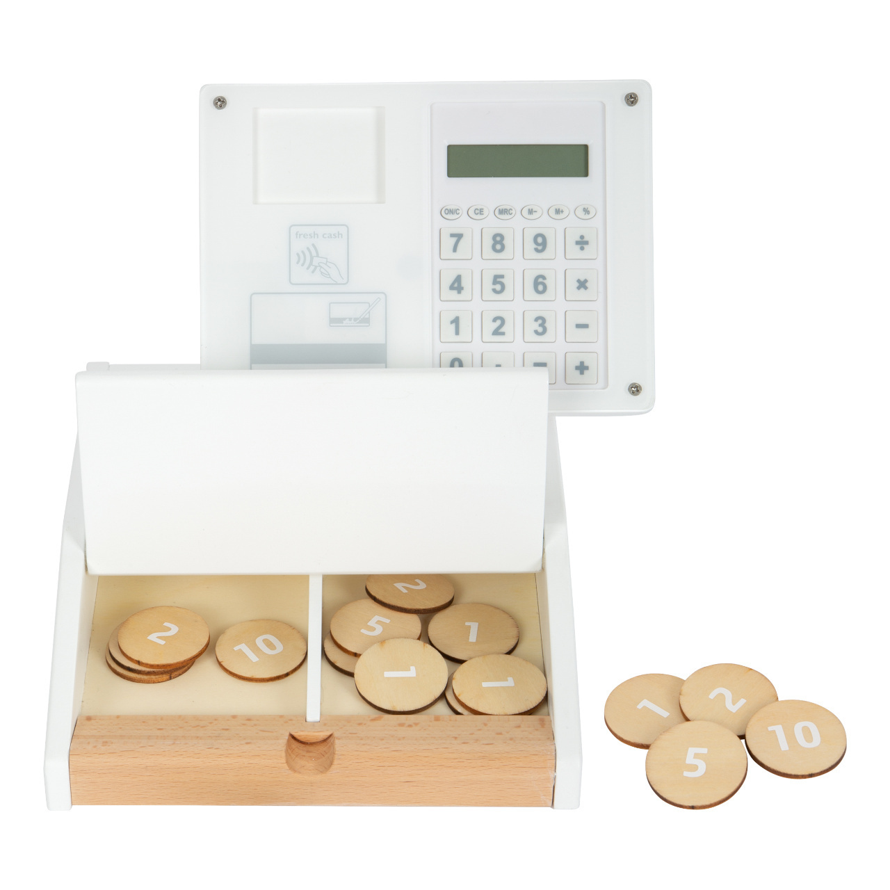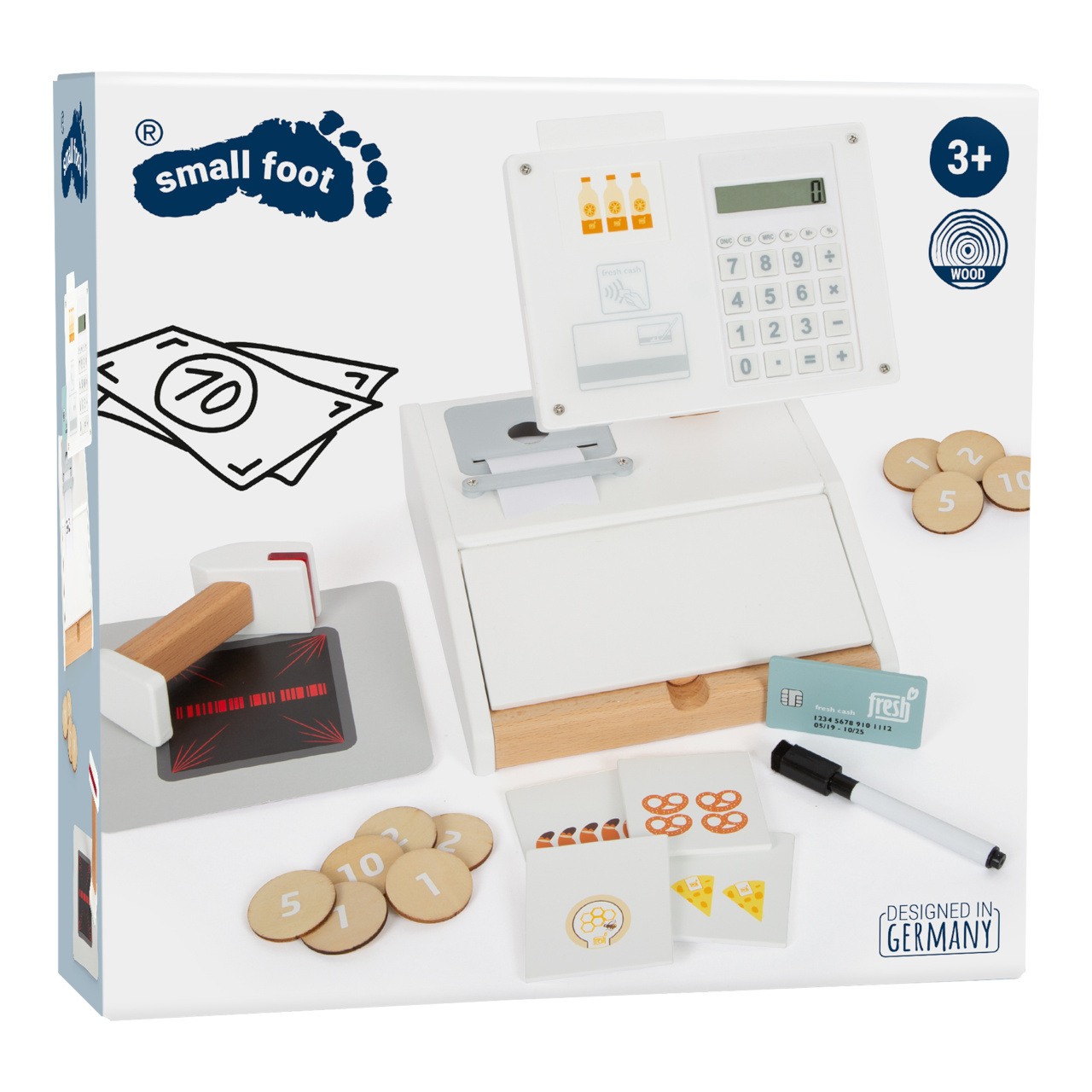 obchodníky. Hlavní vlastnosti: čtečka čárových kódů, trhací role účtenek, otočný monitor, fungující kalkulačka, platební karta, karty produktů, 15 oboustranných dřevěných mincívelký šuplík pokladny lze otevřítkartičky produktů jsou oboustranné, lze je zasunout do