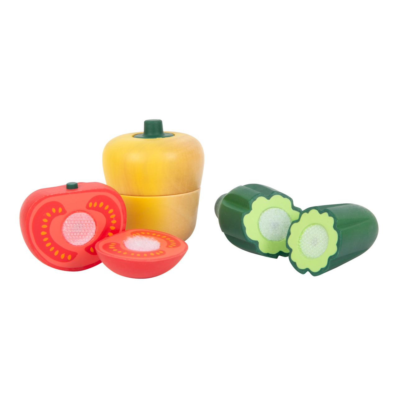 zelenina drží dohromady pomocí suchého zipu. Díky udržitelnému obalu se děti naučí něco nového o ekologii. Krájecí prkénko lze díky oka pověsit. Hlavní vlastnosti: krájecí zelenina z robustního dřevapřírodní vzhled a natištěné detailyobsáhlá sada s prkénkem, nožem,