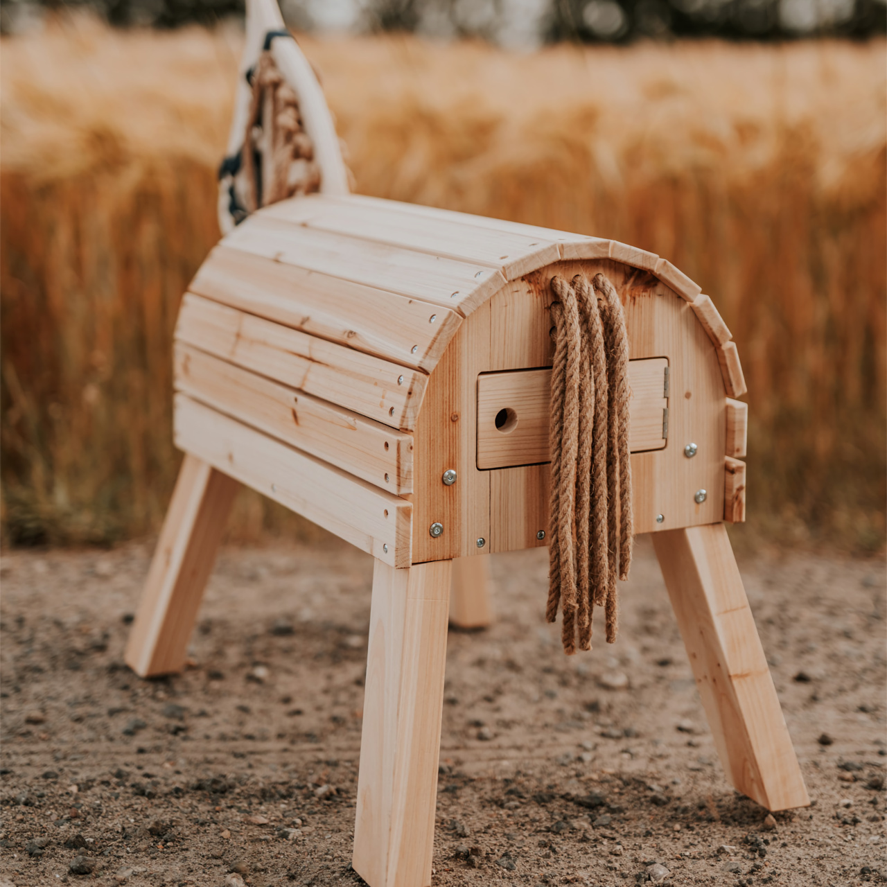 lakem na ochranu dřeva. V balení ohlávka, ke které lze připevnit vodící lano. Hlavní vlastnosti: kompaktní dřevěný koník sisalová hříva a ohonstabilní nohyneošetřené dřevo, odolné vůči povětrnostním vlivům, designujte dle sebeúložný prostor s dvířky v břiše