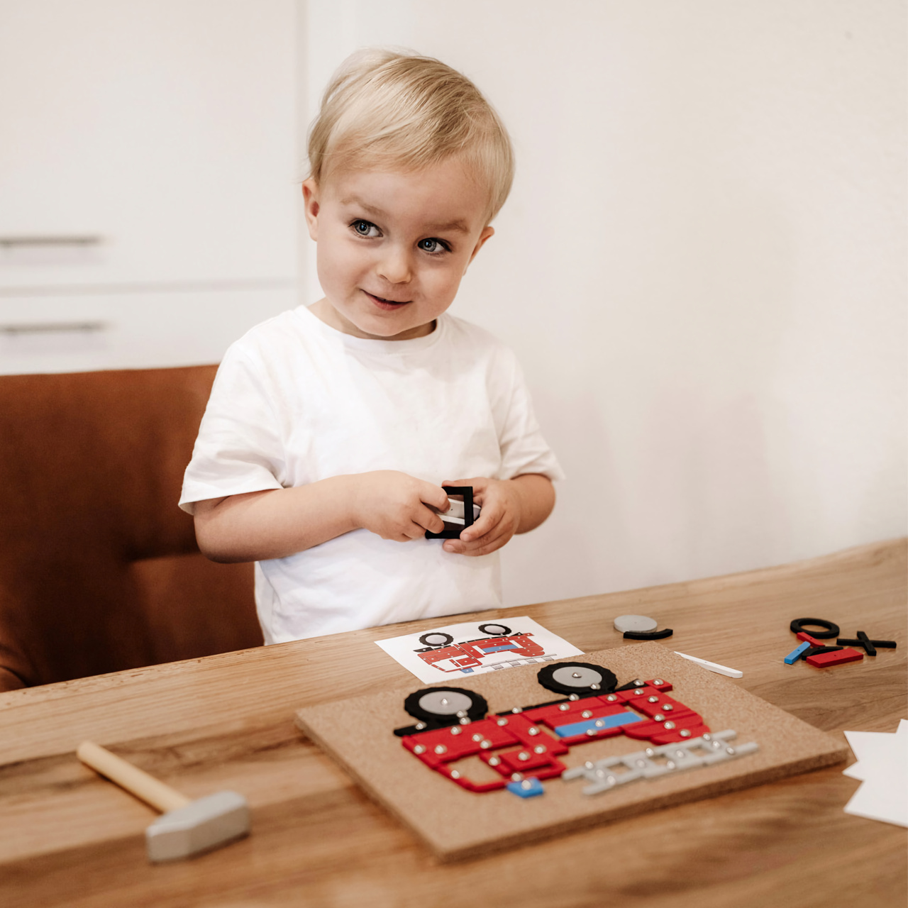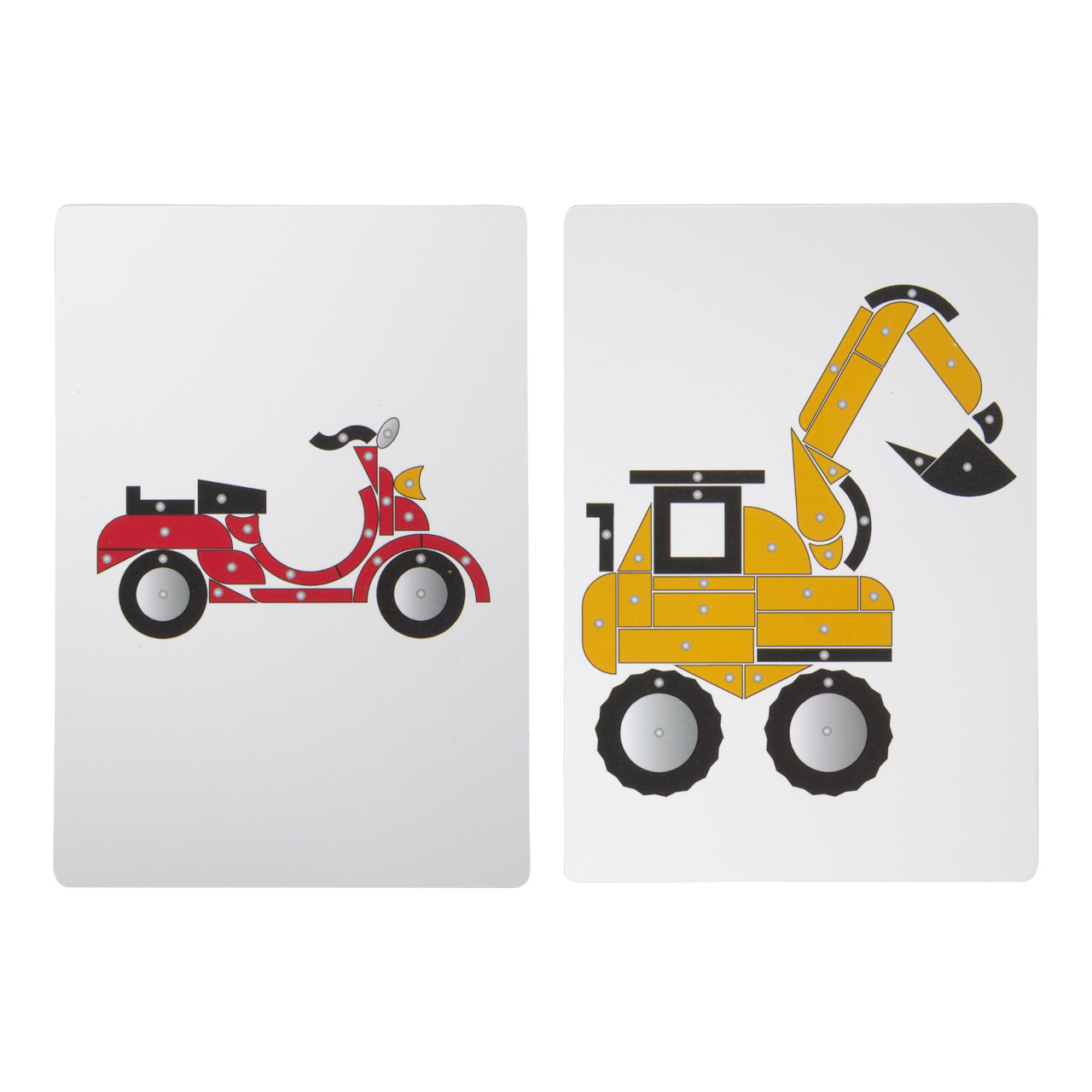 předloh.Klasická zatloukací hra v moderních barvách a nesmrtelném designu, s kterou si děti mohou vytvořit obrázky dopravních prostředků, stavebních strojů, aj. Mohou se řídit obrázkovými předlohami nebo tvořit dle vlastní představivosti. Hračka pomáhá s rozvojem