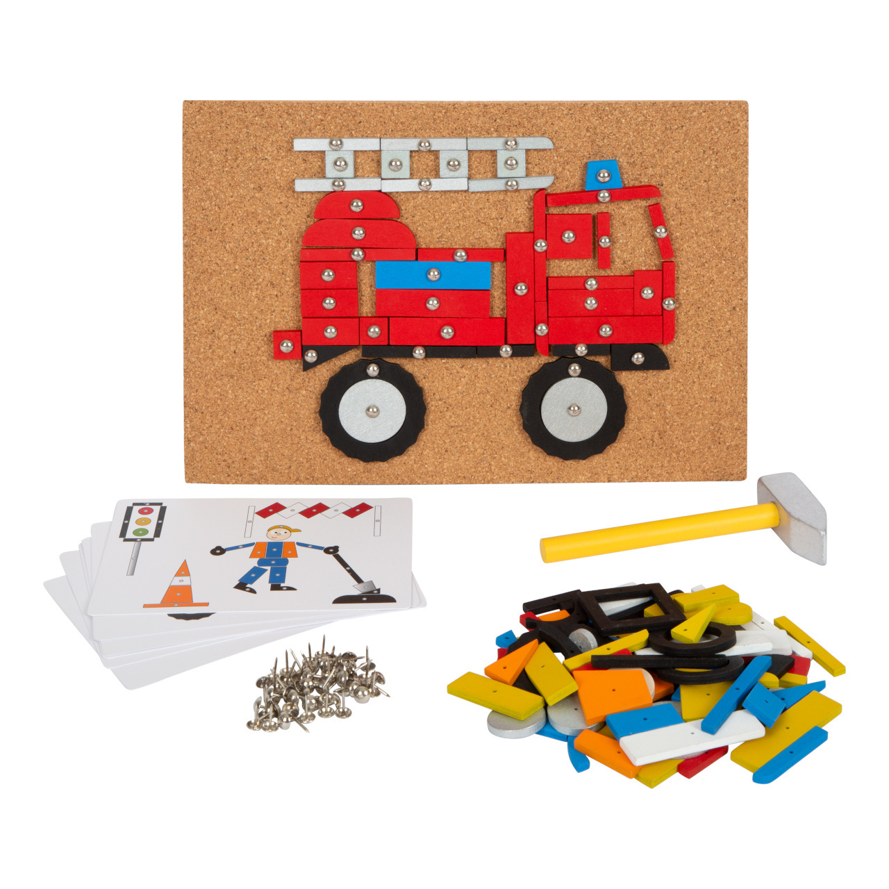 Obsáhlá kreativní hrací sada s tematikou dopravy! V balení najdete korkovou podložku, dřevěné kladivo, připínáčky a mnoho dílků z laminovaného dřeva v rozdílných tvarech a barvách. V krabici, která je vhodná i na uschování této hračky, najdete šest obrázkových