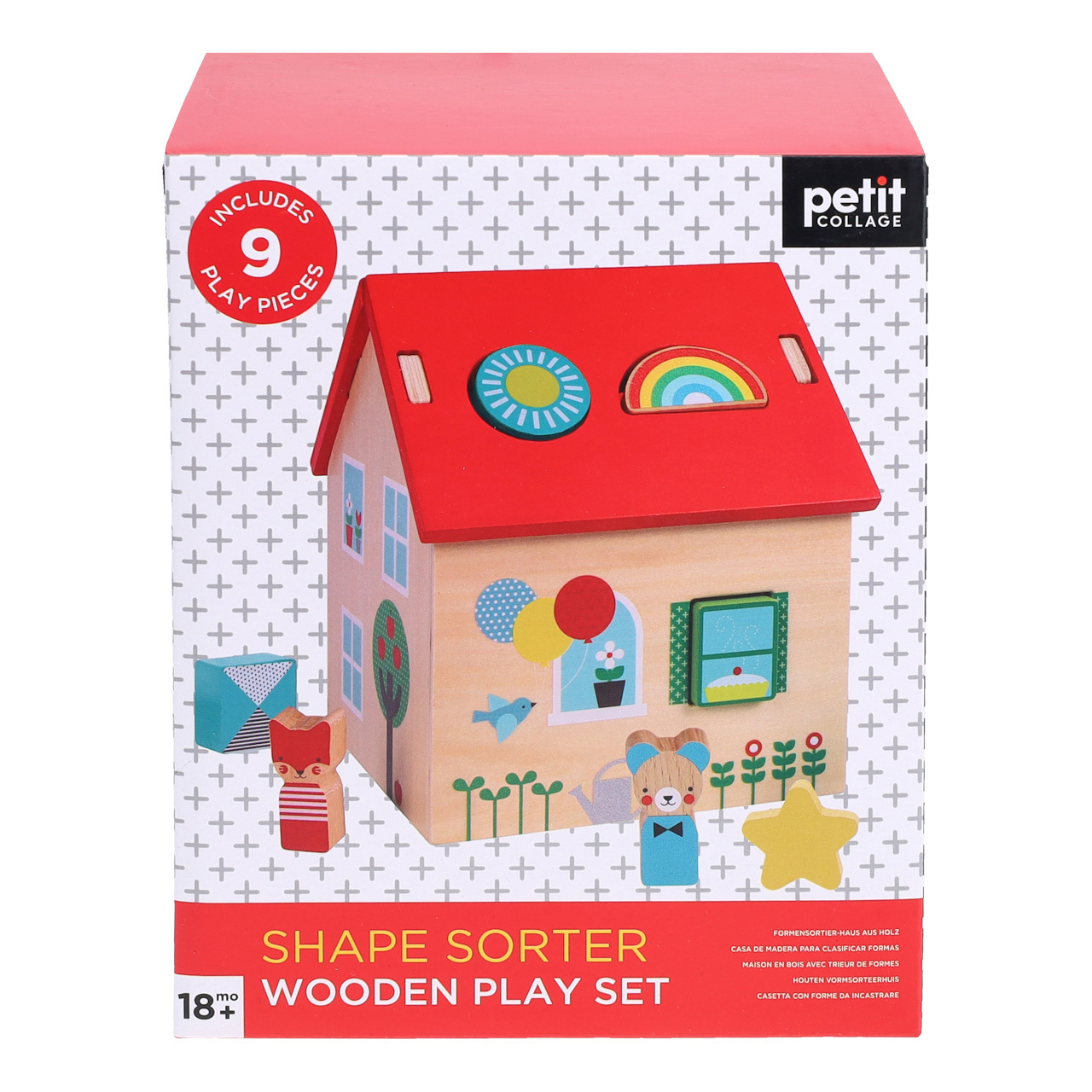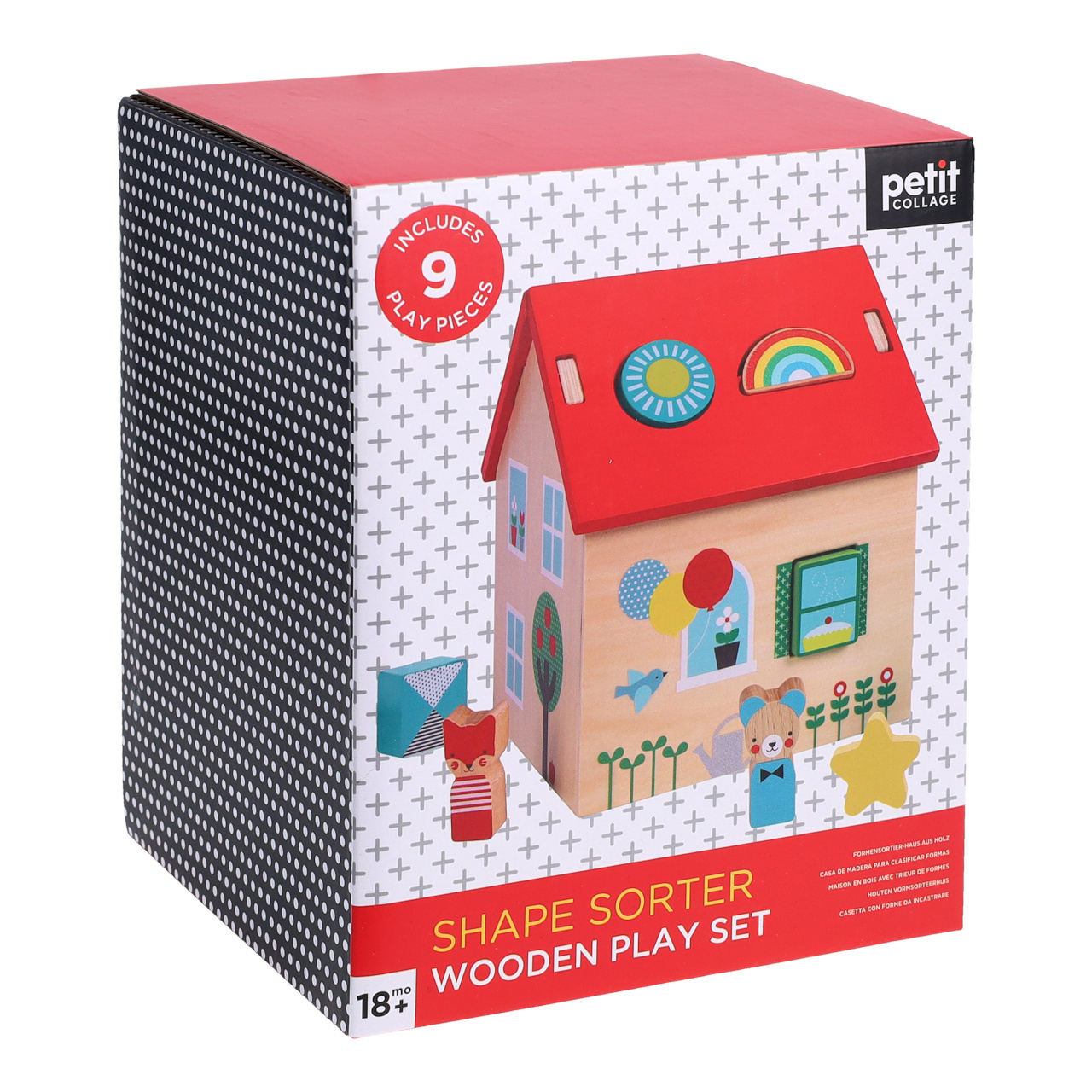 podporujících senzomotorický vývoj. Střechu domečku z lehké překližky lze jednoduše odnímat, aby si děti mohly s figurkami hrát i uvnitř něj. Hračka je robustní a odolná, vyrobená ze 100% FSC® dřeva. Hlavní vlastnosti:domeček s odnímatelnou střechou a 9 dílků ke