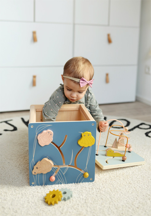Všestranná dřevěná kostka pro motorické aktivity se dvěma korálkovými bludišti, gumovými stromy, za které se lze chytit, a také posuvným bludištěm na víku. Hru na ozubená kolečka se čtyřmi odnímatelnými hvězdicemi a na dotek měkkou medúzou lze použít na přiřazování