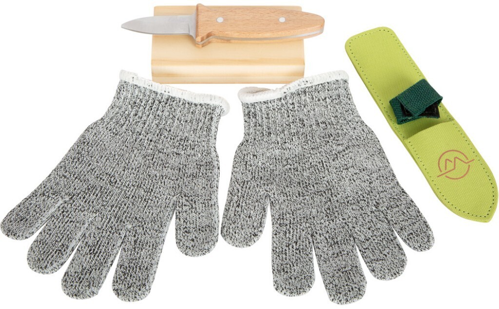 Rozměr nože: 13x3x1 cm Rozměr bloku dřeva: 10x5x2 cm Velikost rukavic: XS Věk: 8+ Materiál: dřevo, plast,