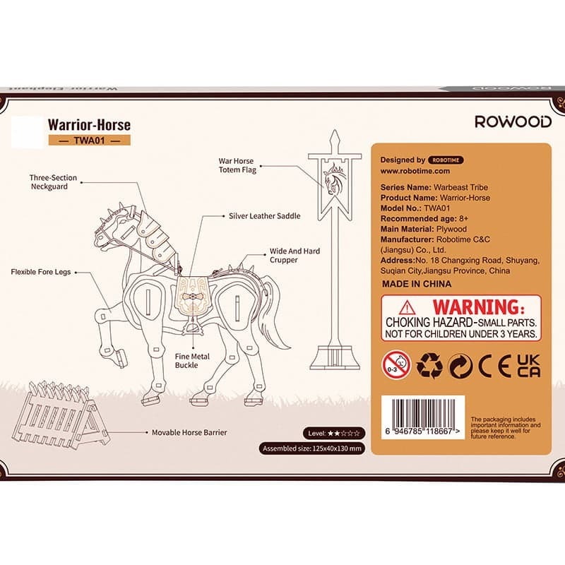 všestrannou ochranu. Břišní část zbroje je navíc opatřena stylovými kovovými přezkami. Kromě samotného koně je součástí této skládačky také totemová bojová vlajka a mobilní zábrana. Skládačka je dodávána v nesloženém stavu, balena v krabici. Vybaveno detailním