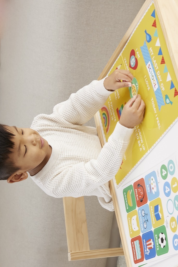 Učiňte velký den Vašich dětí opravdu nezapomenutelným! Znovupoužitelné samolepky jsou skvělou pomůckou nejen pro děti chodící do 1. až 3. třídy. Mohou si vybrat z 97 samolepek, které posléze nalepí na oboustranný list. List má např. kolonky pro věk, výšku, cíl, náladu