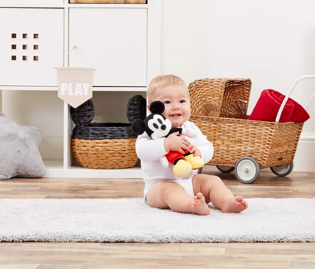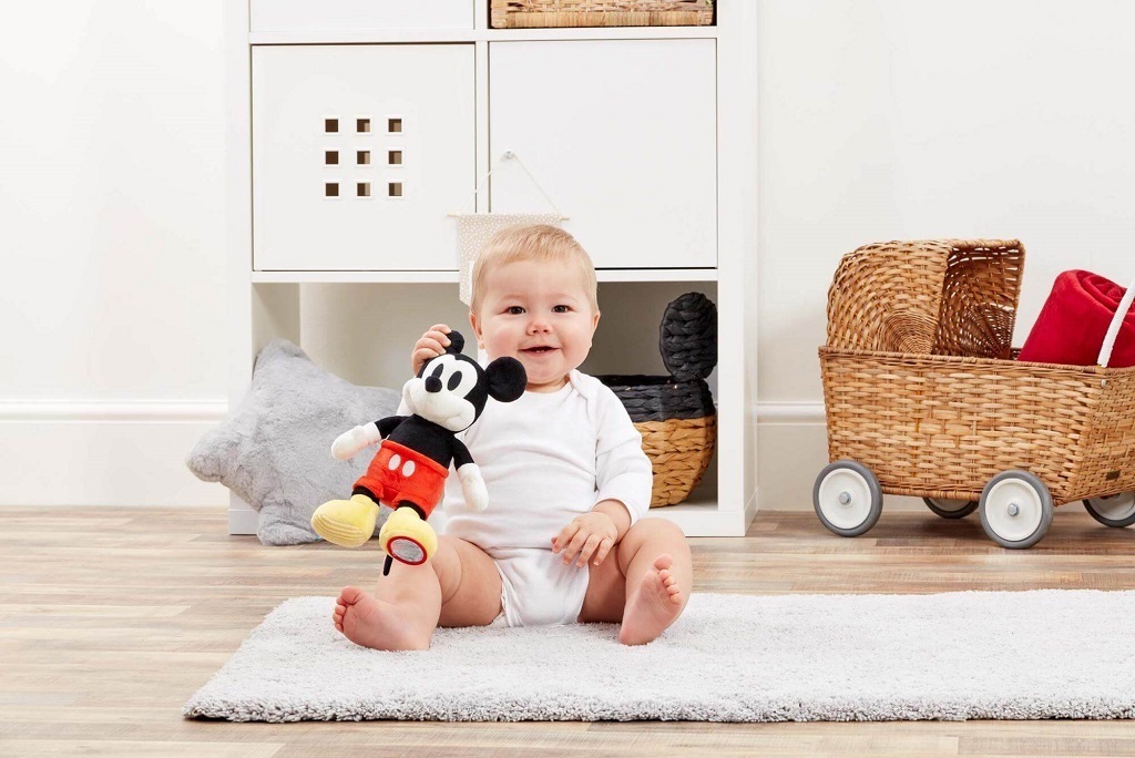 ikonických šortek a má žluté boty, které u dětí podporují hmatové a smyslové zkoumání prostřednictvím hry. Na pravé botě má texturu šňůrky a na levé kruhové zrcátko. Tato hračka také pomáhá rozvoji jemných motorických dovedností. Mickey Mouse je také dokonalým
