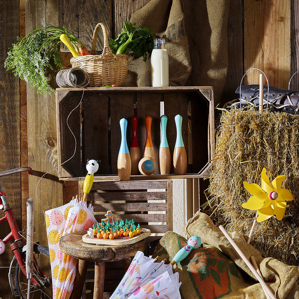 Sada 6 kuželek z lakovaného dřeva. Kuželky jsou napůl přírodní a napůl barevné. V praktickém balení naleznete také 2 dřevěné koule. Zabaleno v bavlněném pytlíku. Vyrobeno ve Francii. Hlavní vlastnosti: vyrobeno z odolného dřevabaleno v praktickém látkovém pytlíkuobsahuje 6 kuželek a 2 hrací...