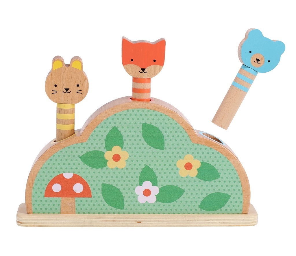 Tlačte, mačkejte a zažijte úžasnou zábavu s touto robustní dřevěnou hračkou. Děti si tuto hru zamilují! Obsahuje tři postavičky kolíčků a základnu odrazového můstku. Zvířátka jsou nabitá pružinou a připravena na vyskočení ze svého pelíšku. Hra rozvíjí jemnou