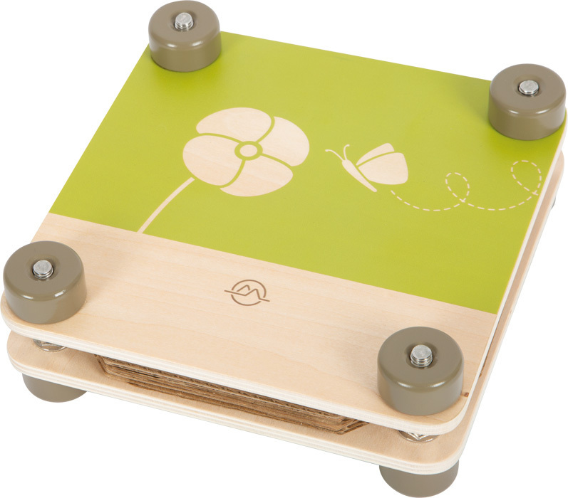 Jednoduchým vložením nasbíraných přírodních pokladů mezi vrstvy papíru a lepenky je snadno uchováte. Čtyři kovové šrouby a matice umístěné v dřevěných kroužcích usnadňují dětem jeho používání tím, že jim umožňují silný úchop a dostatečnou sílu ke stlačení
