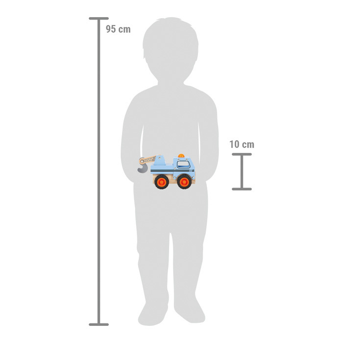 Na robustních pogumovaných kolech je tento odtahový vůz vyrobený z certifikovaného dřeva FSC® všude tam, kde je třeba provést odtah porouchaného vozidla. Díky pohyblivému nakládacímu jeřábu s hákem, který funguje jako tažné zařízení, je v dětském pokoji možná