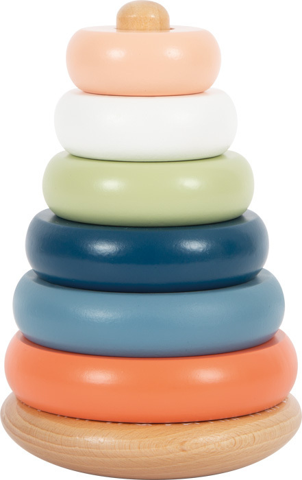 poskytuje pochopení barev a velikostí. Zaoblená základna umožňuje, aby se nasazovací věž kývala tam a zpět, což zábavným způsobem zpochybňuje dětskou zručnost. Pohyblivý kolík zvyšuje bezpečnost. Tato klasická motorická hračka vhodná pro děti vyrobená z robustního