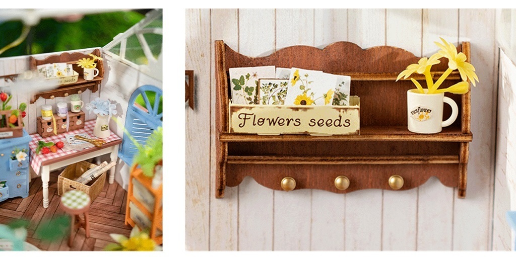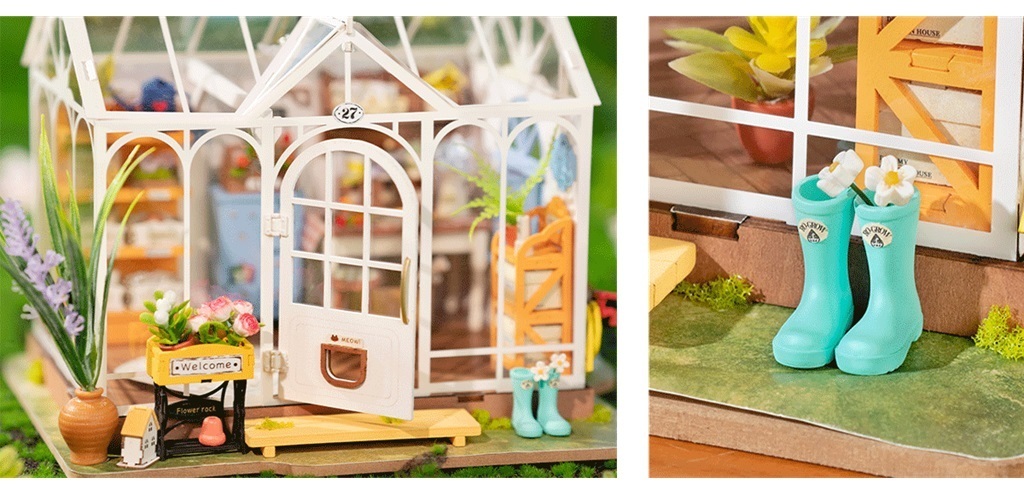 také detailní zahradnické nástroje, květinový lustr, který poskytuje teplé světlo, a dokonce i prostorný skleník s tajným zahradním boxem uvnitř a odolnou konstrukcí. Přibližná doba 6 hodin montáže vás provede světem realistického zahradnického zážitku. Vaše ruce budou