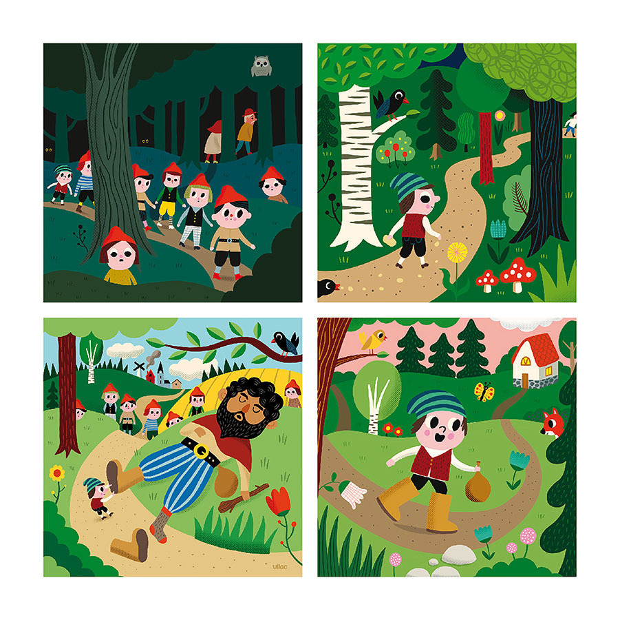 Já jsem paleček, malinkatý chlapeček, naši nejsou doma sami, já jsem táty, já jsem mámy. Když jeden z nich nemůže, paleček jim pomůže.“ Sada čtyř obrázkových puzzlí na téma pohádky O Palečkovi. Sestavte 4 obrázky, každý o 9 dílcích, abyste objevili nádherný