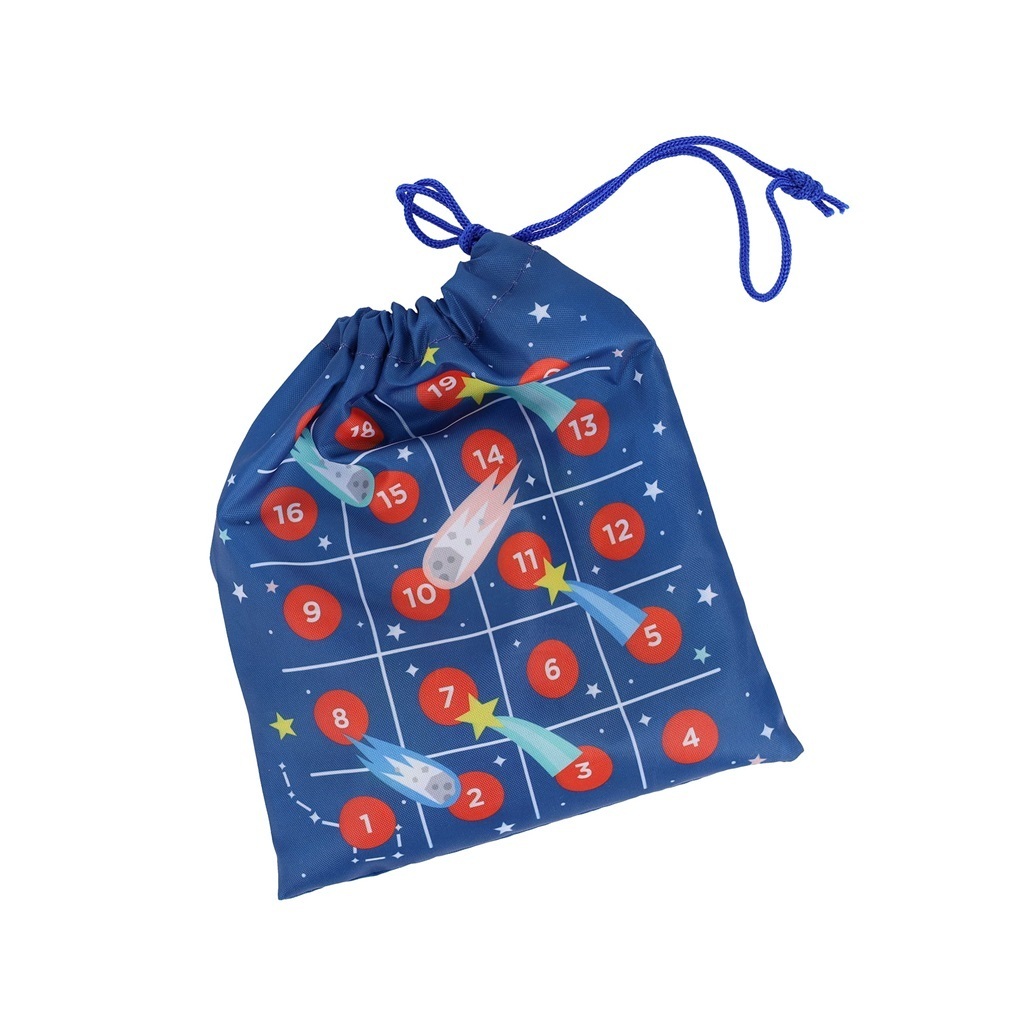 a raketami po mřížkách vytištěných na praktickém cestovním pytlíku se stahovací šňůrkou s motivy vesmíru. Když se hráč zastaví na políčku s obrázkem komety, postoupí o řadu výše a políčko s padajícím meteoritem jej zase vrátí o řadu níže. Hry jsou skvělým