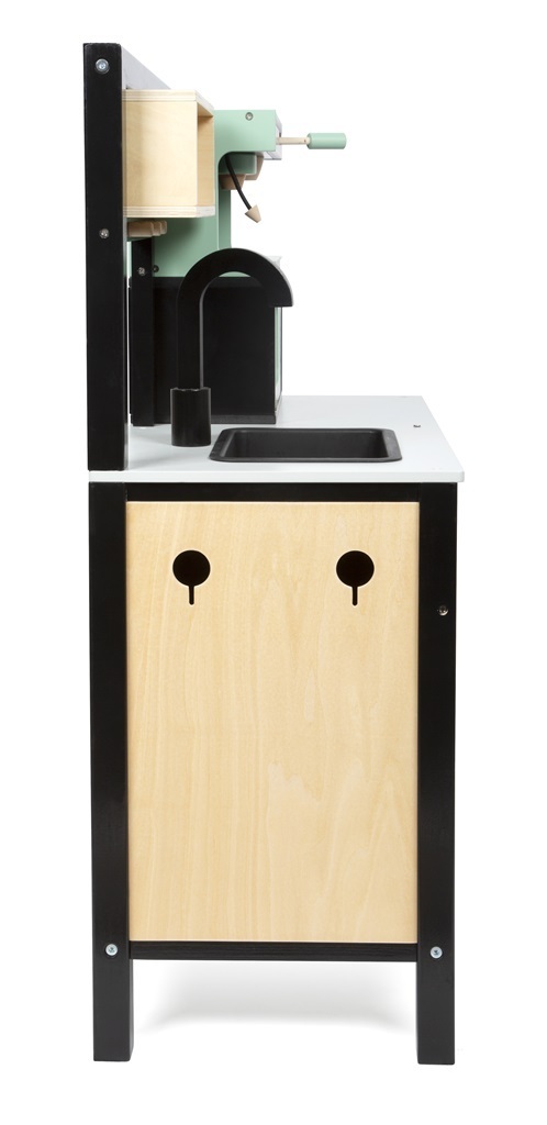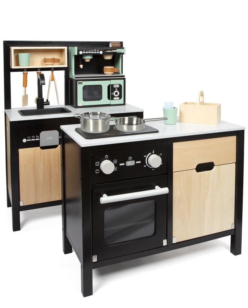 Tato dřevěná dětská kuchyňka v industriálním designu nabízí vše, co malé kuchařky nebo kuchaři potřebují pro vaření. Předností je moderní vzhled ve stylové barevné kombinaci černého rámu a přírodního dřeva, praktický kuchyňský ostrůvek, který se dá použít