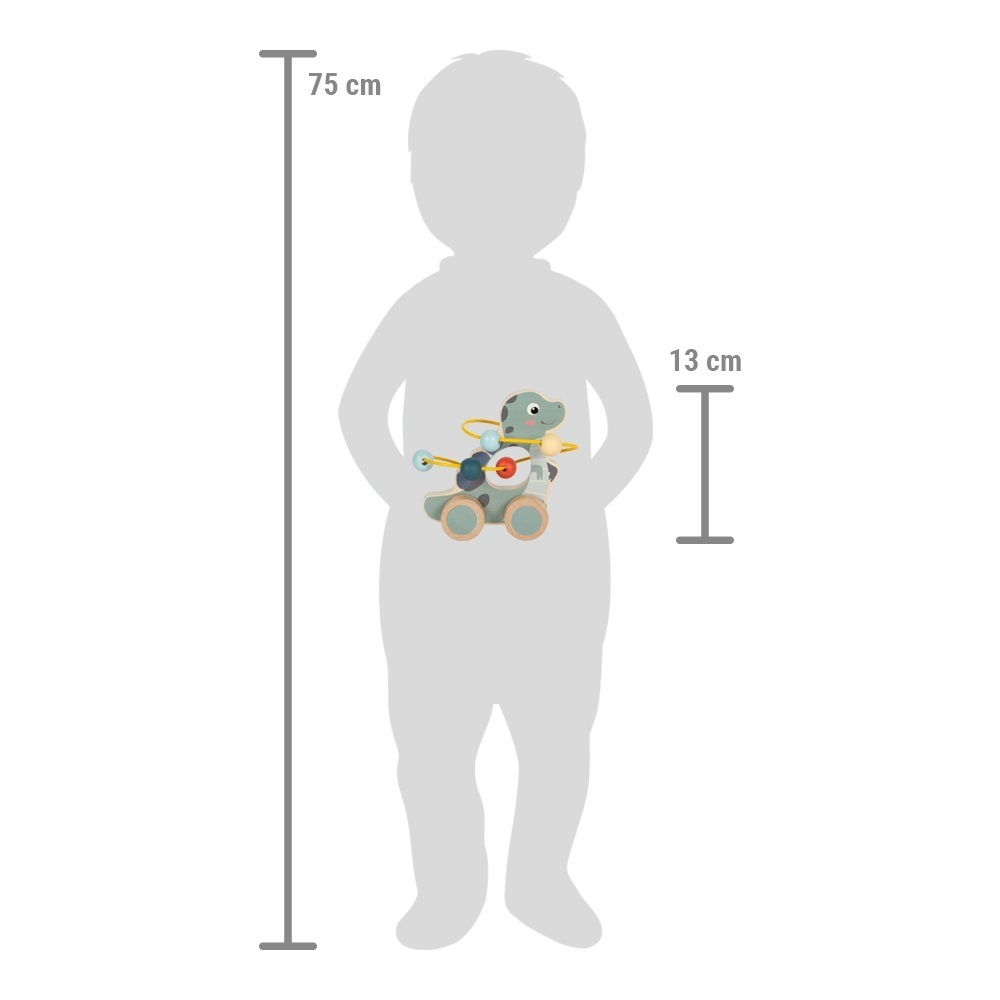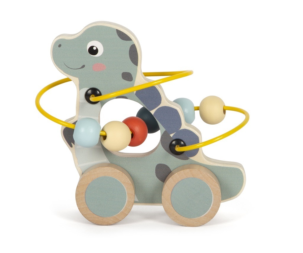 Dinosauři jsou tak roztomilí! Tento usměvavý dinosaurus v pastelových barvách je vyroben z pevného certifikovaného FSC® dřeva a padne dětem přesně do ruky. Mohou ho tlačit, jezdit s ním, posílat si ho mezi sebou nebo se zabavit protahováním 6 barevných korálků na labyrintu,