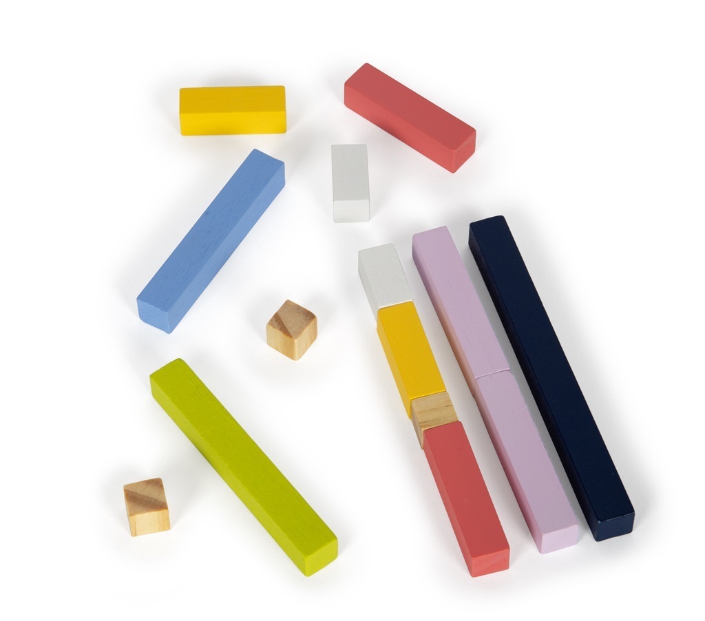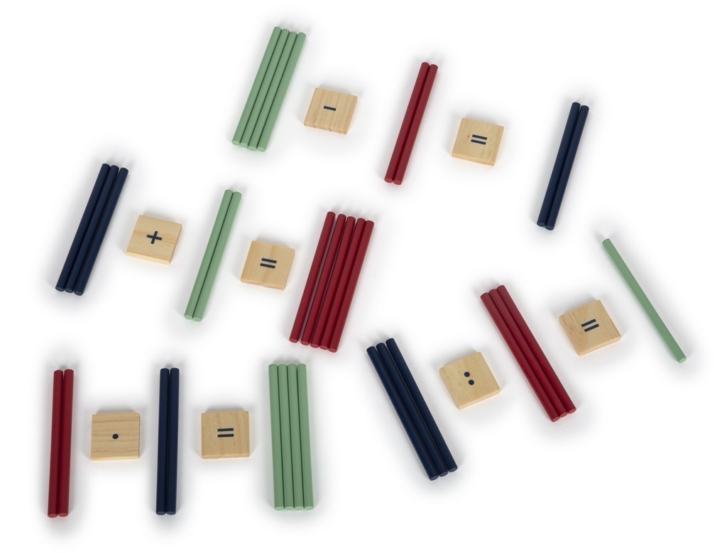 matematických operací – sčítání, odčítání, násobení a dělení pomocí třídění, porovnávání a počítání. Naleznete zde podložku pro počítání, velké množství barevných kostek různých tvarů, jako jsou krychličky, hranolky, tyčinky, a dále kostky s čísly a