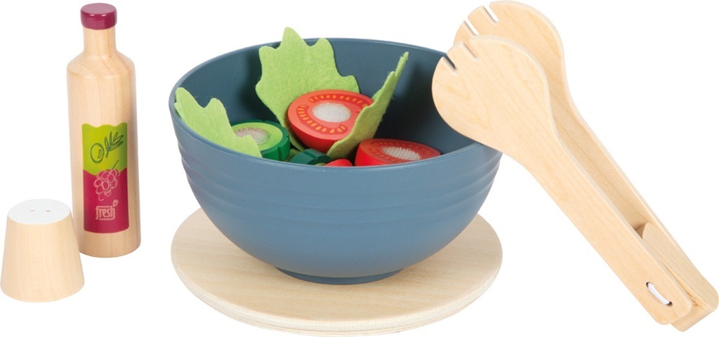 role. Touto cestou se také děti seznamují se zdravou výživou a přípravou čerstvých potravin. Salátová sada je perfektním doplňkem do každé dětské kuchyňky! Sada obsahuje: dřevěnou salátovou mísu s víkem, okurku, 2 rajčata, hlávku salátu, struhadlo, kleště na salát,