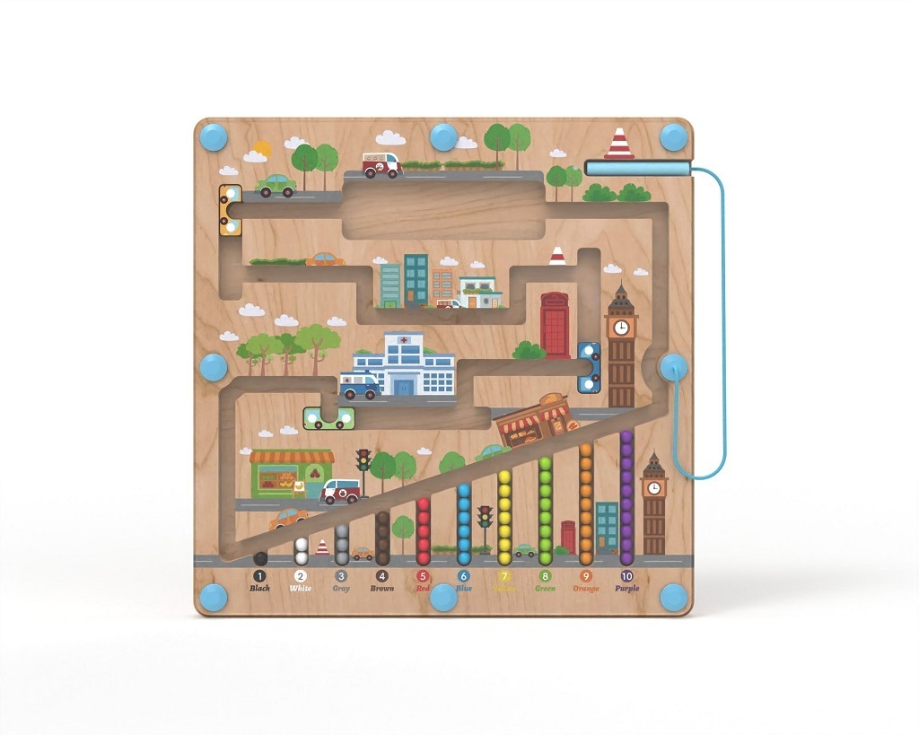 Vydejte se na cestu městem s barevnými kuličkami. Provedete úspěšně různobarevné kuličky všemi zákoutími? K převozu Vám pomohou barevné autobusy. K vedení kuliček se při hře využívá magnetické ukazovátko, které prověří dětskou trpělivost a koordinaci rukou a zraku. Dokážete pak navrátit kuličky...