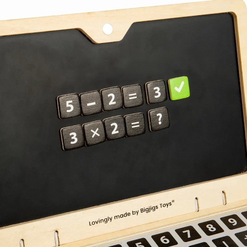 Počítejte, pište, čtěte a učte se hrou s dřevěným notebookem! Na magnetické obrazovce notebooku si děti mohou pomocí magnetických písmen, číslic a symbolů sestavovat slova či procvičovat matematiku. Anebo psát na tabuli křídou, kterou snadno odstraní pomoci myši s gumou.