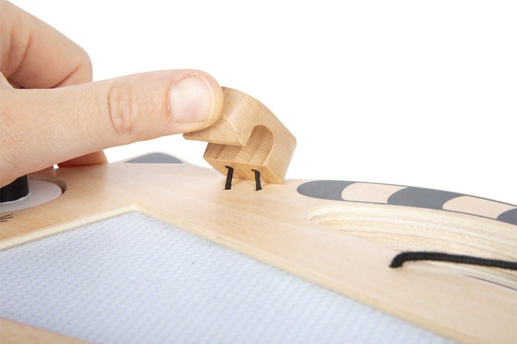 Rozměry tabulky: 29x22x3 cm Věk: 2+ Materiál: dřevo, tkanina, guma, kov, plast