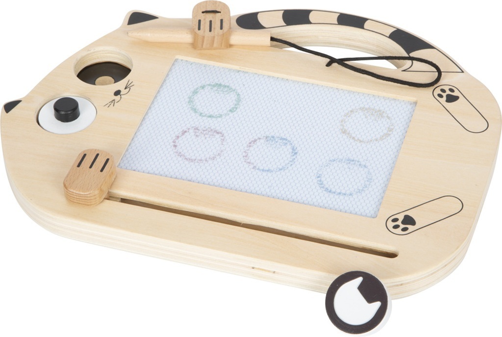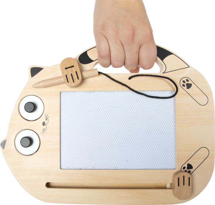 Kreativní zábava pro malé umělkyně a umělce! Magnetická kreslící tabulka ve tvaru kočky je ideální pro děti, které milují kreslení. Pomocí pera lze znovu a znovu vytvářet nové obrázky. Dvě razítka s motivy kočičích očí a kočičí hlavy nabízejí další možnosti