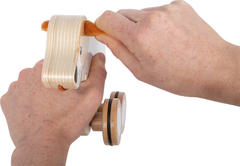 Rozměry: 20x9x15 cm Délka šňůry: 60 cm Věk: 12m+ Materiál: dřevo, látka, guma, plyš