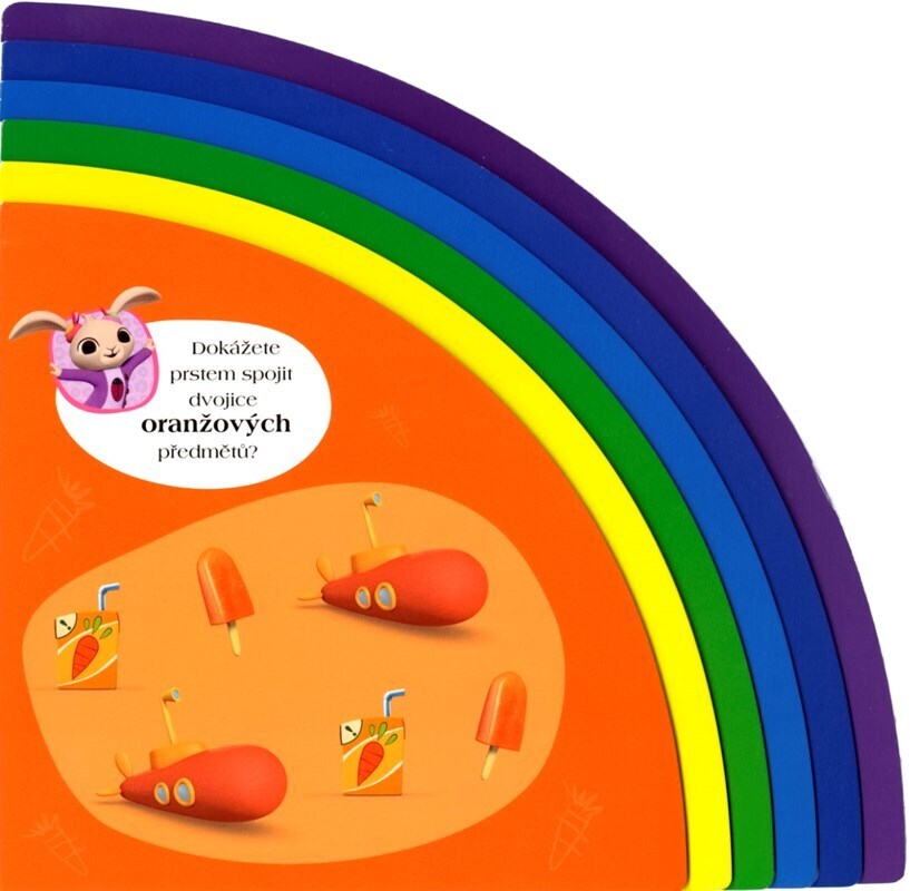 Krásná fialová, světlá i tmavá modrá, zelená a jasně žlutá! Seznamte se s barvami duhy spolu s Bingem, Flopem a ostatními kamarády v krásně tvarovaném leporelu, které zaujme všechny malé čtenáře.