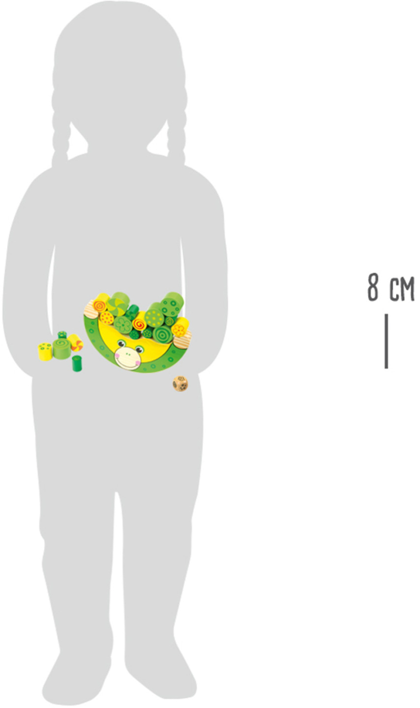 hry: Položte žábu na rovnou plochu. 1 hráč: Hoď kostkou a příslušnou barvu polož na žabku. Hoď kostkou znovu a umísti další barevný váleček. Ujisti se, že žába drží rovnováhu a nespadne. Pokračuj ve hře do doby, než umístíš poslední váleček. Pokud ztratí žába