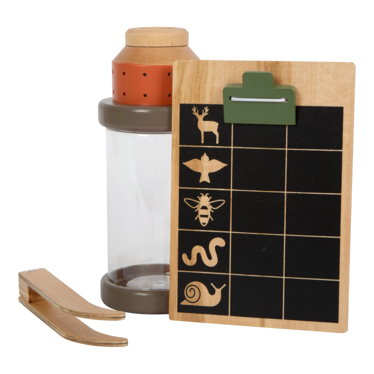 zkoumat okolní přírodu. Se sadou vybavení se stane okolí domova místem plným překvapení a zkoumání. Za pomocí výzkumné sady mohou i nejmladší děti bádat a objevovat nové věci na zahradě, v lese nebo na louce. Viditelné dřevo, zaoblené hrany a barvy přírody, to jsou