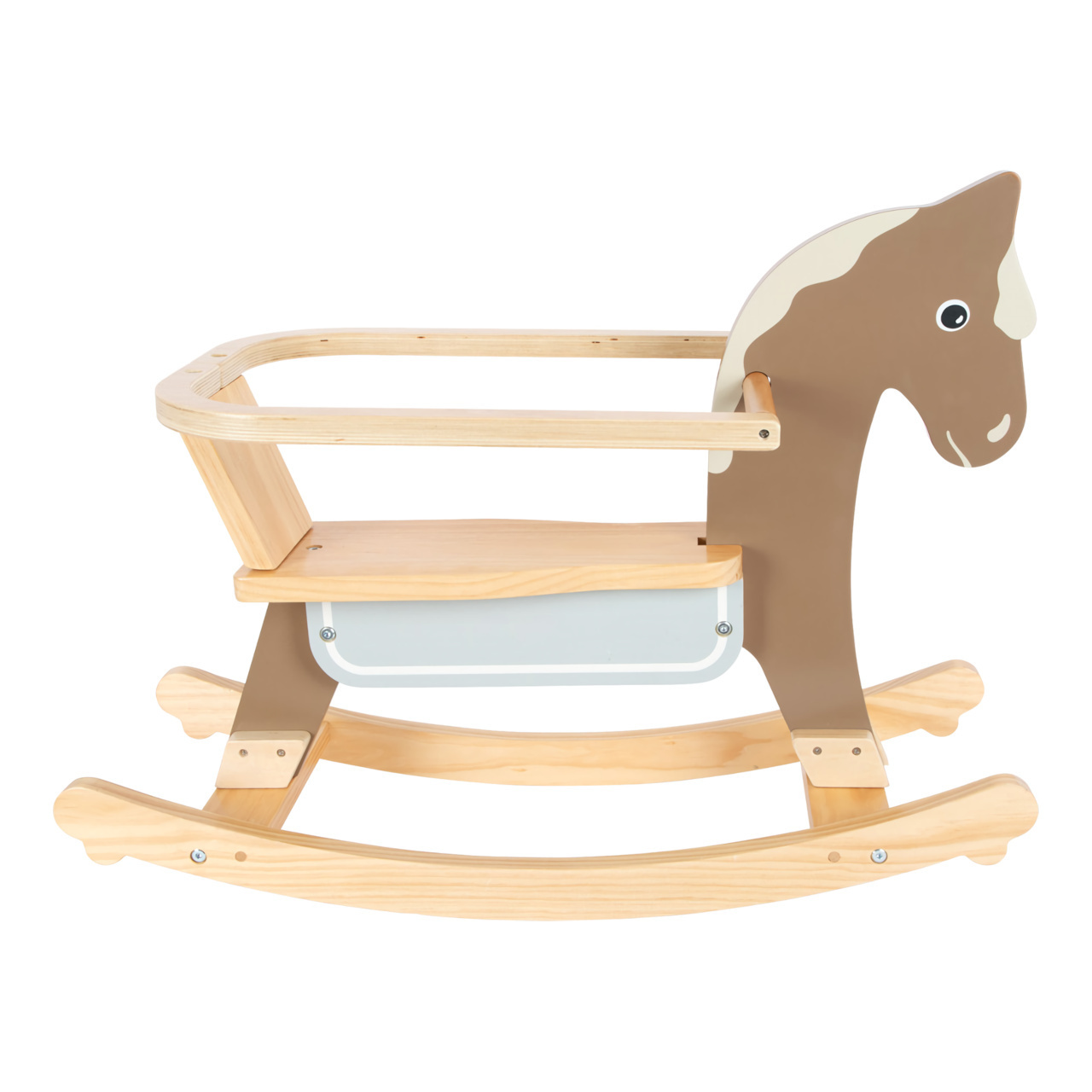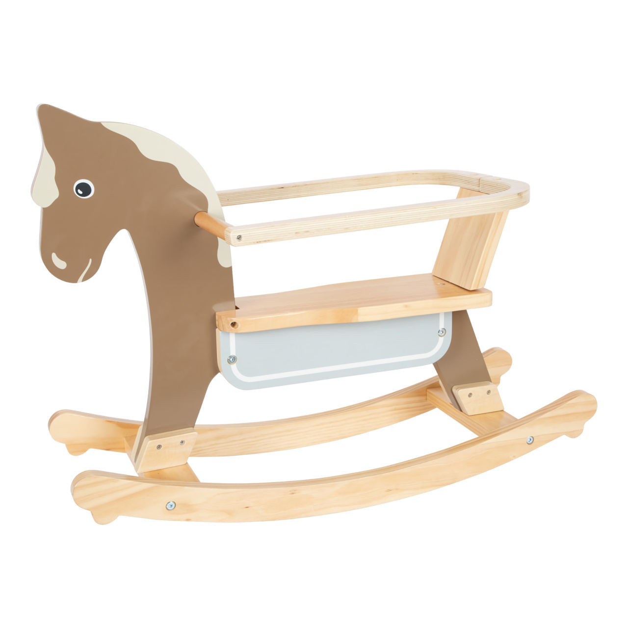 Vzhůru do sedel a cvalem kupředu! Houpací koník může dětem pomoci zesílit, rozvíjet koordinaci pohybů a rovnováhu. Pro zajištění maximální bezpečnosti je vybaven dorazy a opěradlem s hrazením, které lze snadno odejmout, jakmile dítě povyroste. Hračka je vyrobena z kombinace odolné překližky...