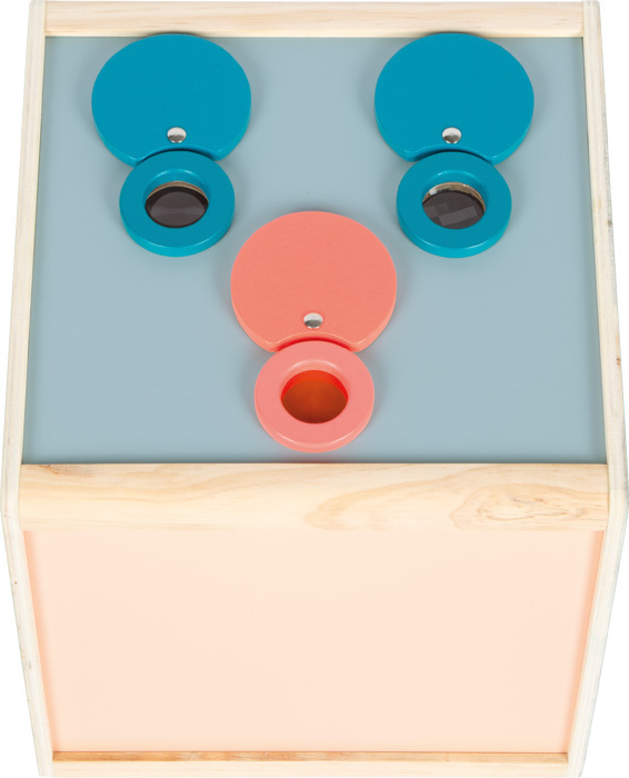 rozvoje smyslů a motorických dovedností. Je vhodná i pro ergoterapeutické účely. Lupa, fazetová čočka a červená čočka umožňují nový pohled na předměty, které mají být prozkoumány uvnitř boxu. Tři dřevěné čočky lze snadno vyjmout. Otvory na horní straně lze pak