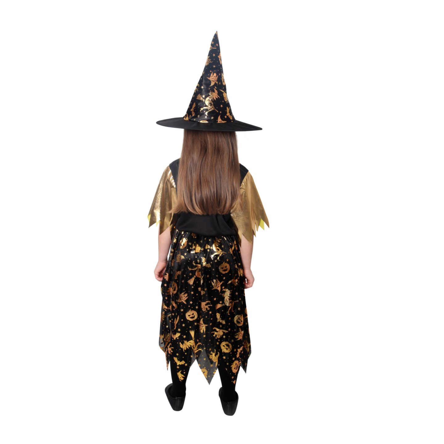 Dětský kostým čarodějnice černo-zlatá s kloboukem (M)
