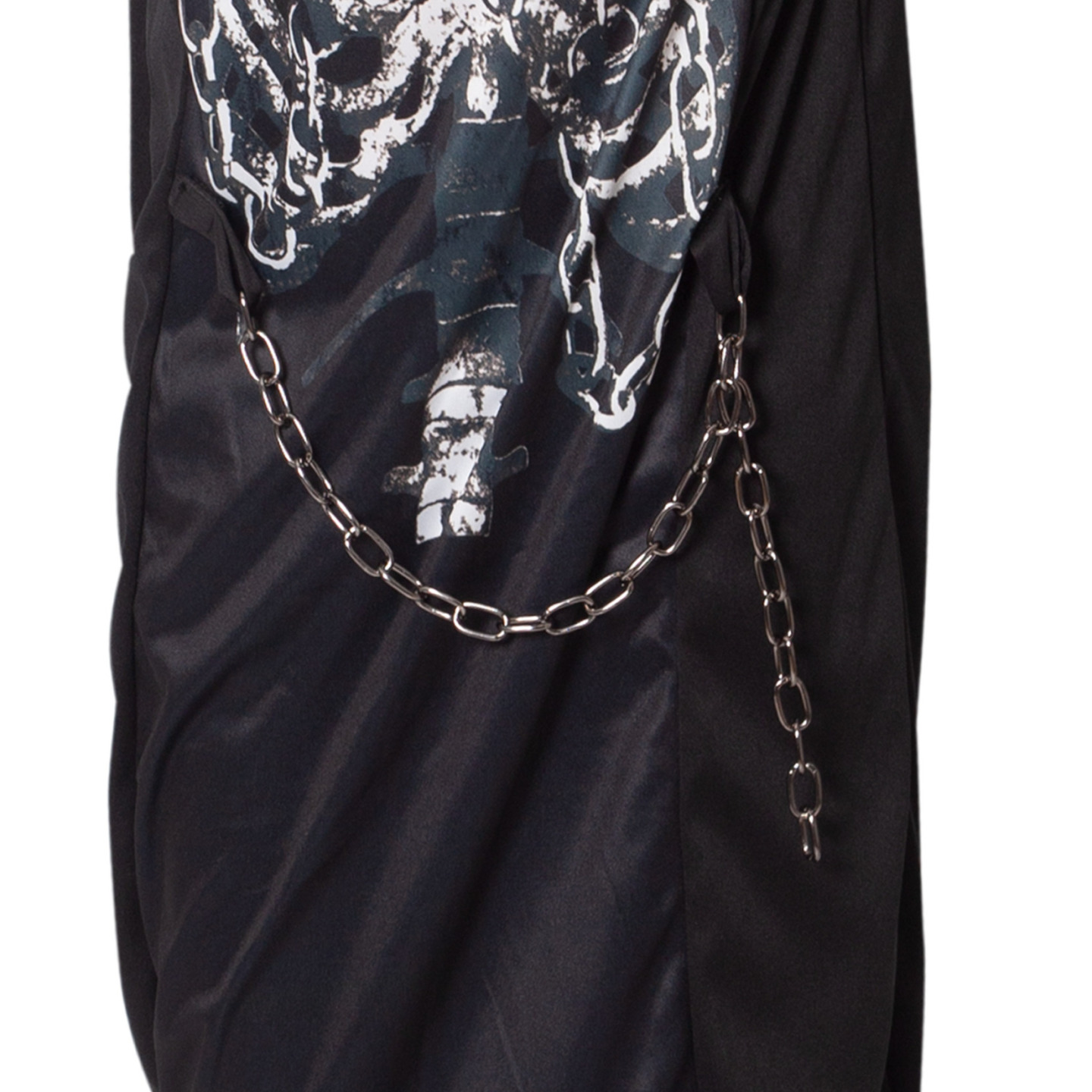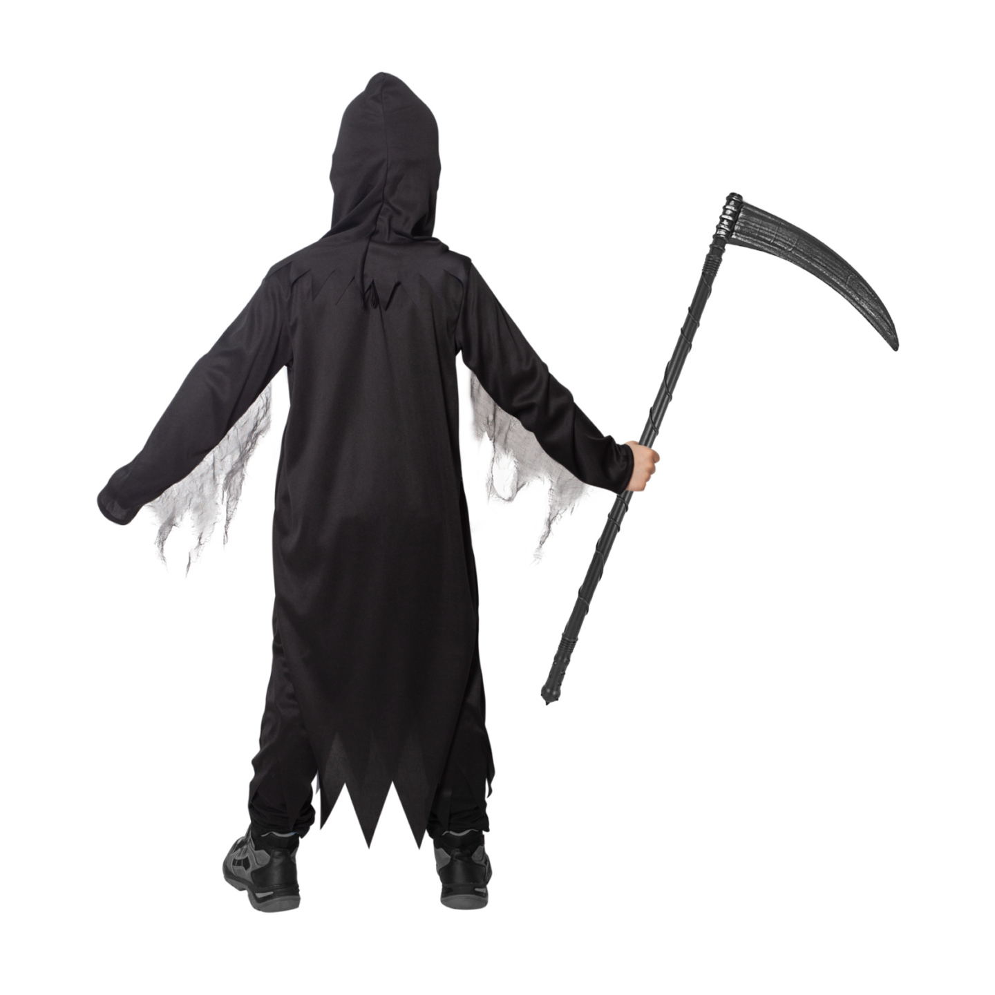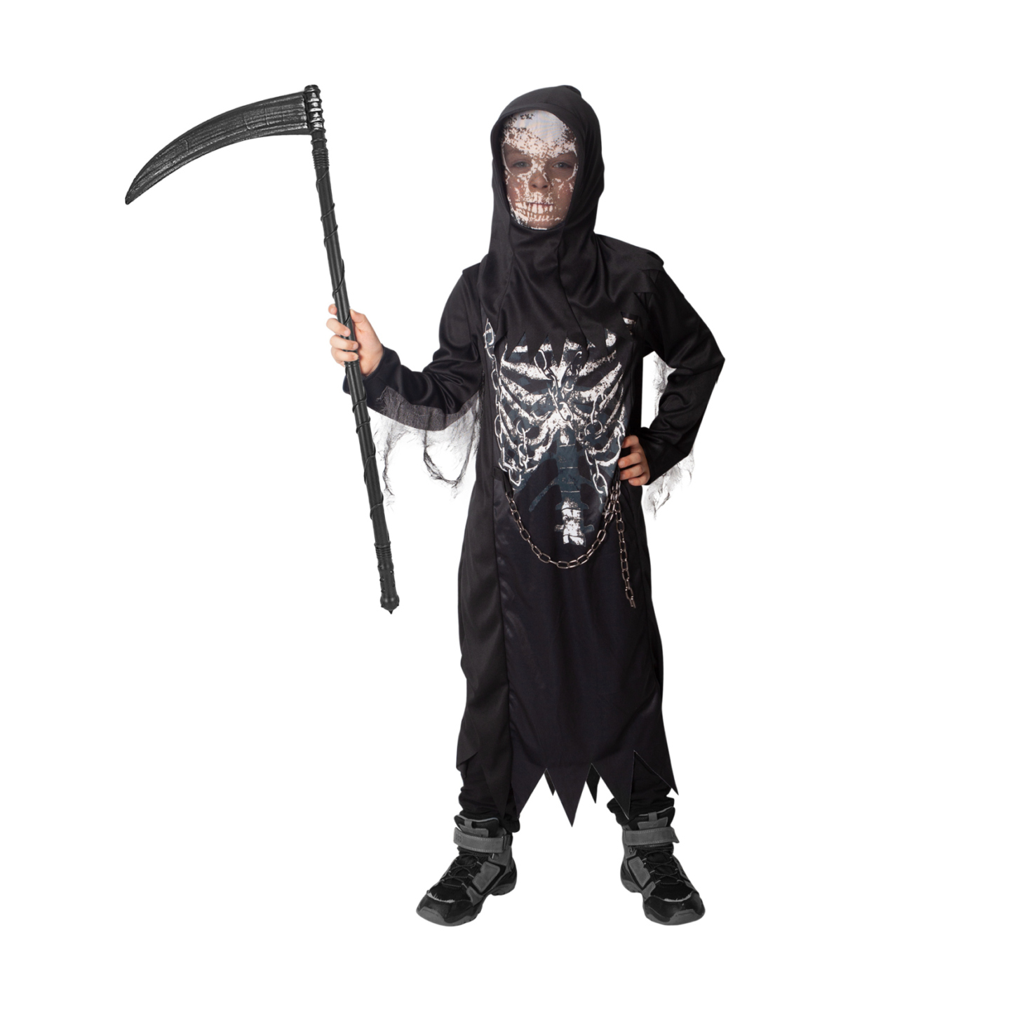 Strašidelný karnevalový kostým s motivem smrtky! Kostým ve velikosti S je určen pro děti ve věkovém rozmezí 4-6 let (105-116 cm). Balení obsahuje černý hábit s bílým potiskem kostry a kapuci. Součástí kostýmu je řetěz. Neobsahuje kosu.