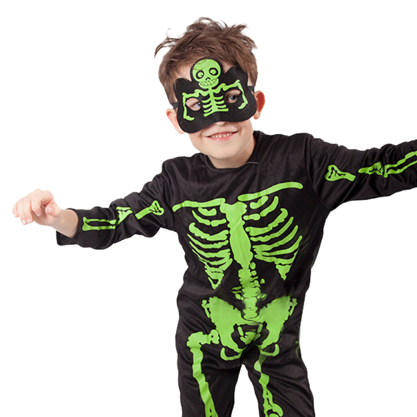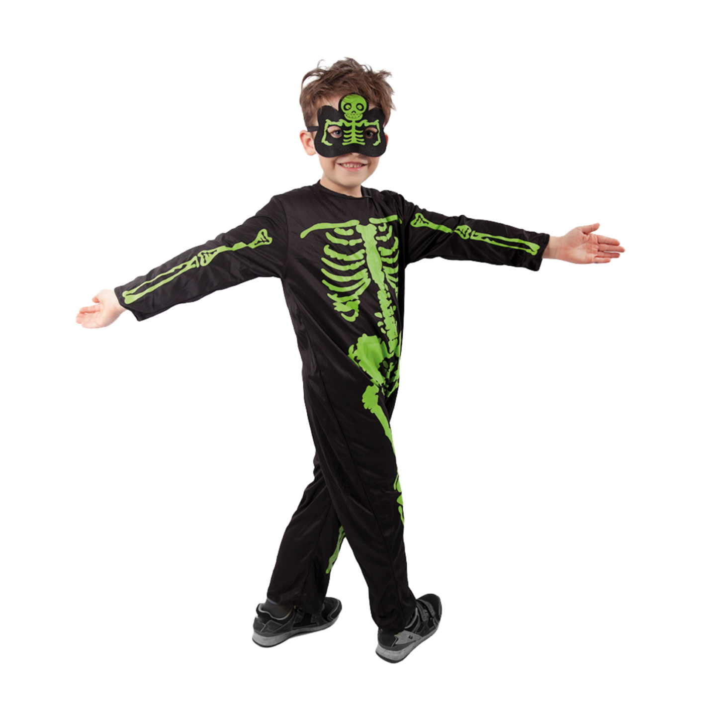 Strašidelný karnevalový kostým s motivem kostlivce! Kostým ve velikosti M je určen pro chlapečky ve věkovém rozmezí 6-8 let. Balení obsahuje černou kombinézu a masku s motivem zeleného kostlivce.