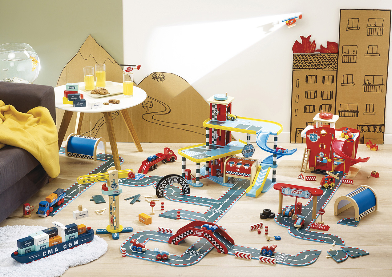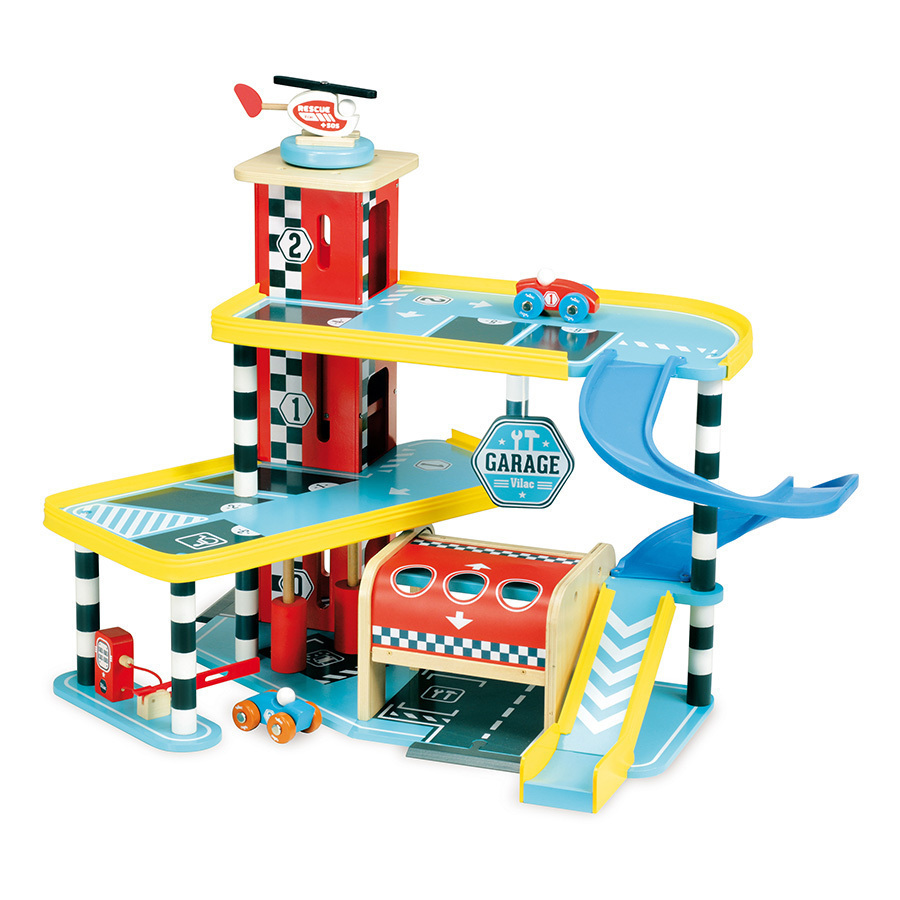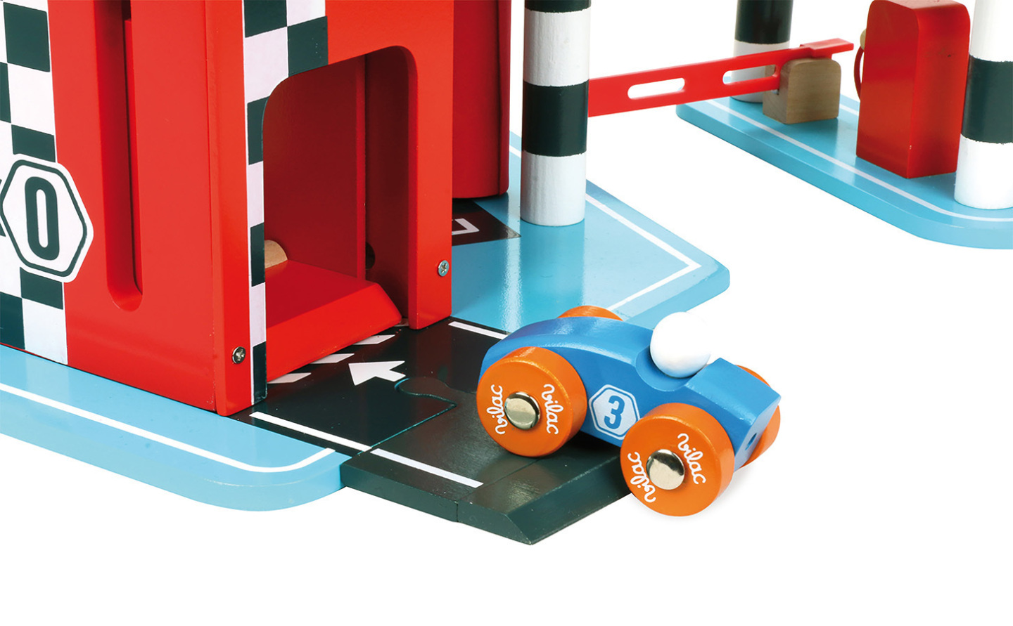 Hračka pro malé závodníky. Jste připraveni na nová dobrodružství? Velká dřevěná garáž s rampou, která nabízí množství mechanických detailů jako jsou výtah, zatahovací dveře, parkovací závora, čerpací stojan nebo mycí kartáče. Součástí garáže je také dvojice