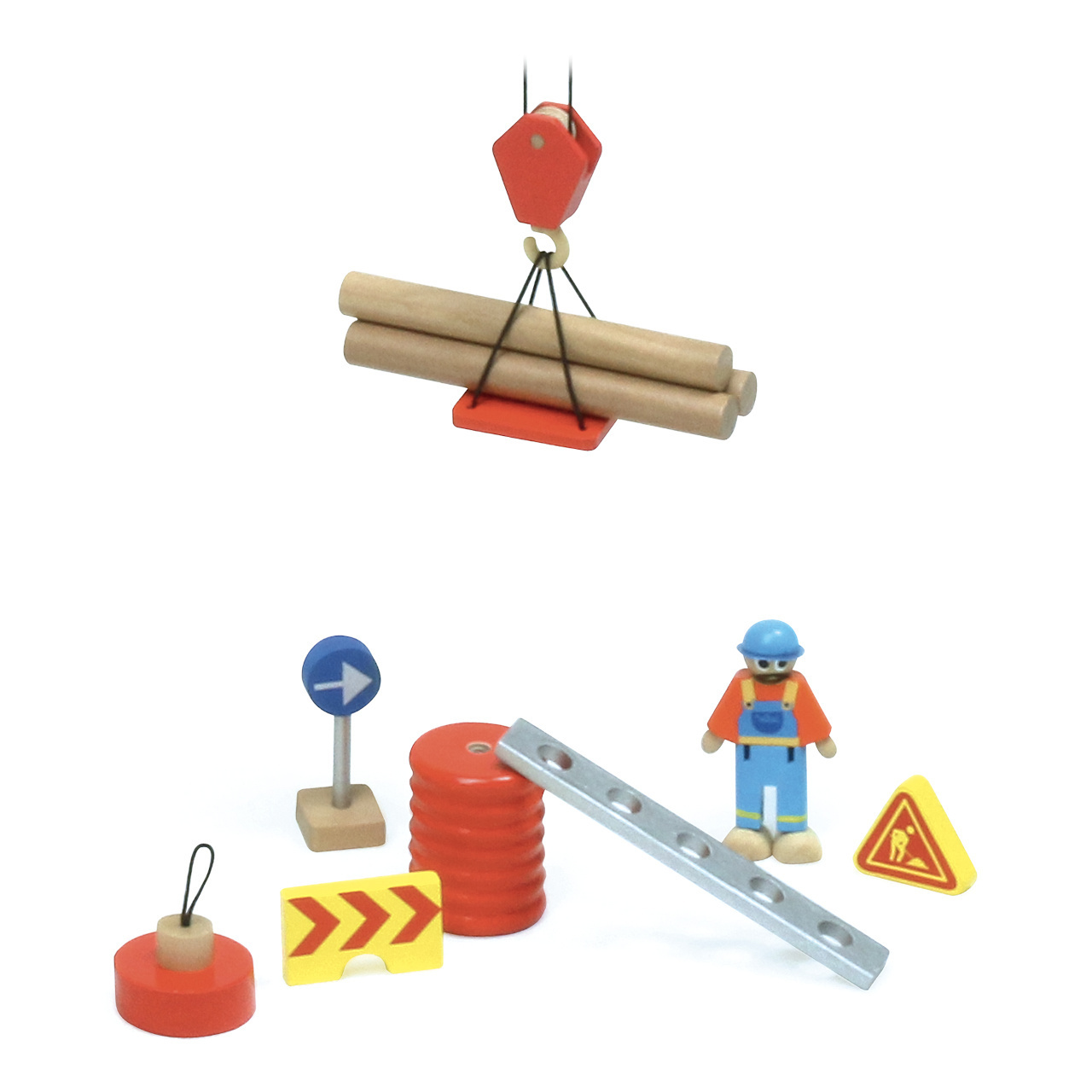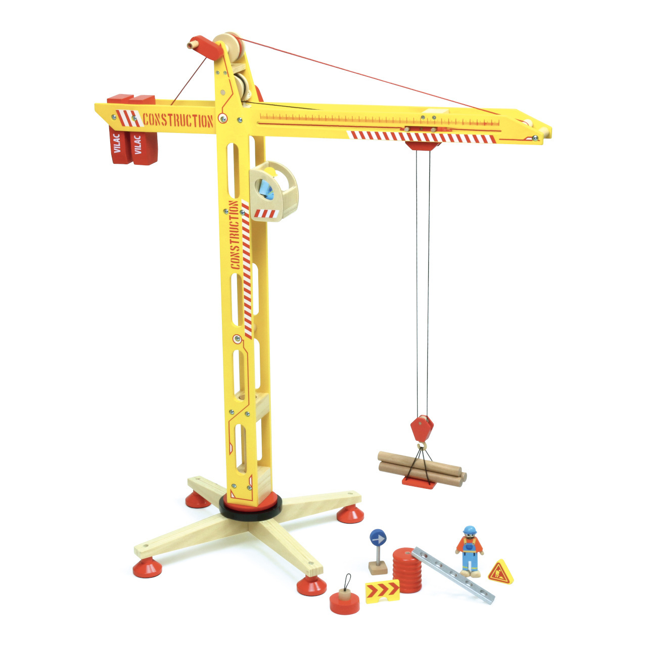 příslušenstvím naleznete pohyblivé figurky jeřábníka a dělníka, plošinu, magnet, různá břemena, ale i značky nezbytné k ohraničení probíhající práce. Vyrobeno z masivního dřeva a odolné překližky, ošetřeno atraktivními nezávadnými barvami. Hlavní vlastnosti: