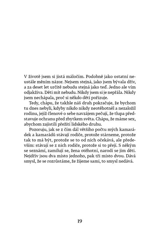 Odjakživa věděla, že děti nechce. Osm let už chodí s Philipem a vždycky byli zajedno, že je mít nebudou – aspoň doteď. Philip si totiž začíná uvědomovat, že by se možná otcem stát chtěl… Do toho jejich nejlepší kamarádi čekají první dítě a matka by si přála vnoučata. Najednou jsou všude...