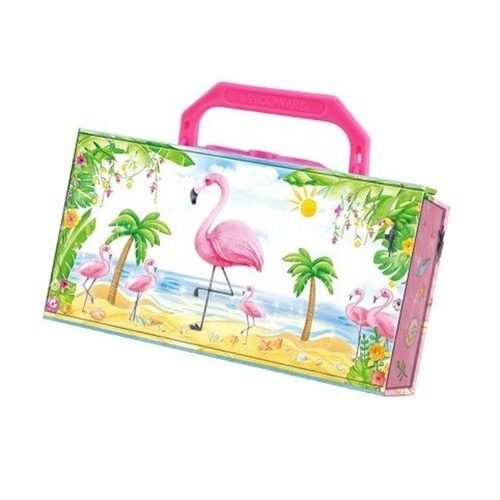 Uložte si své poklady do kufříkové šperkovnice s krásným designem plameňáka. Skvělý doplněk pro malé princezny a parádnice. Výrobek je z pevného, odolného papíru s hladkou povrchovou úpravou. Vhodné pro děti od 6ti let.