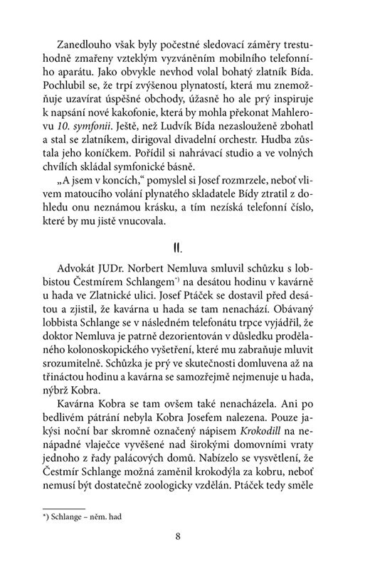 Ústřední hrdina románu Josef Ptáček žije poklidným životem záletníka. To se náhle změní, když potká záhadnou hraběnku Marchfeldovou, kterou zamýšlí citově infiltrovat. Situace se mu vymkne z rukou, překvapivě však získá vysoké postavení v továrně v moravském pohraničí, odkud má k hraběnce...